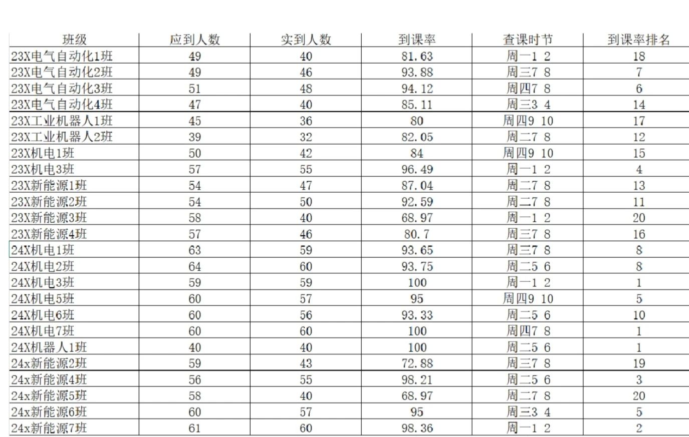 广汉书院团委办公室工作人员对智能制造与汽车学院(江门校区)第四周的学生课堂情况和学生到课率进行了统计。现将第四周的查课数据汇总结果给予公布。