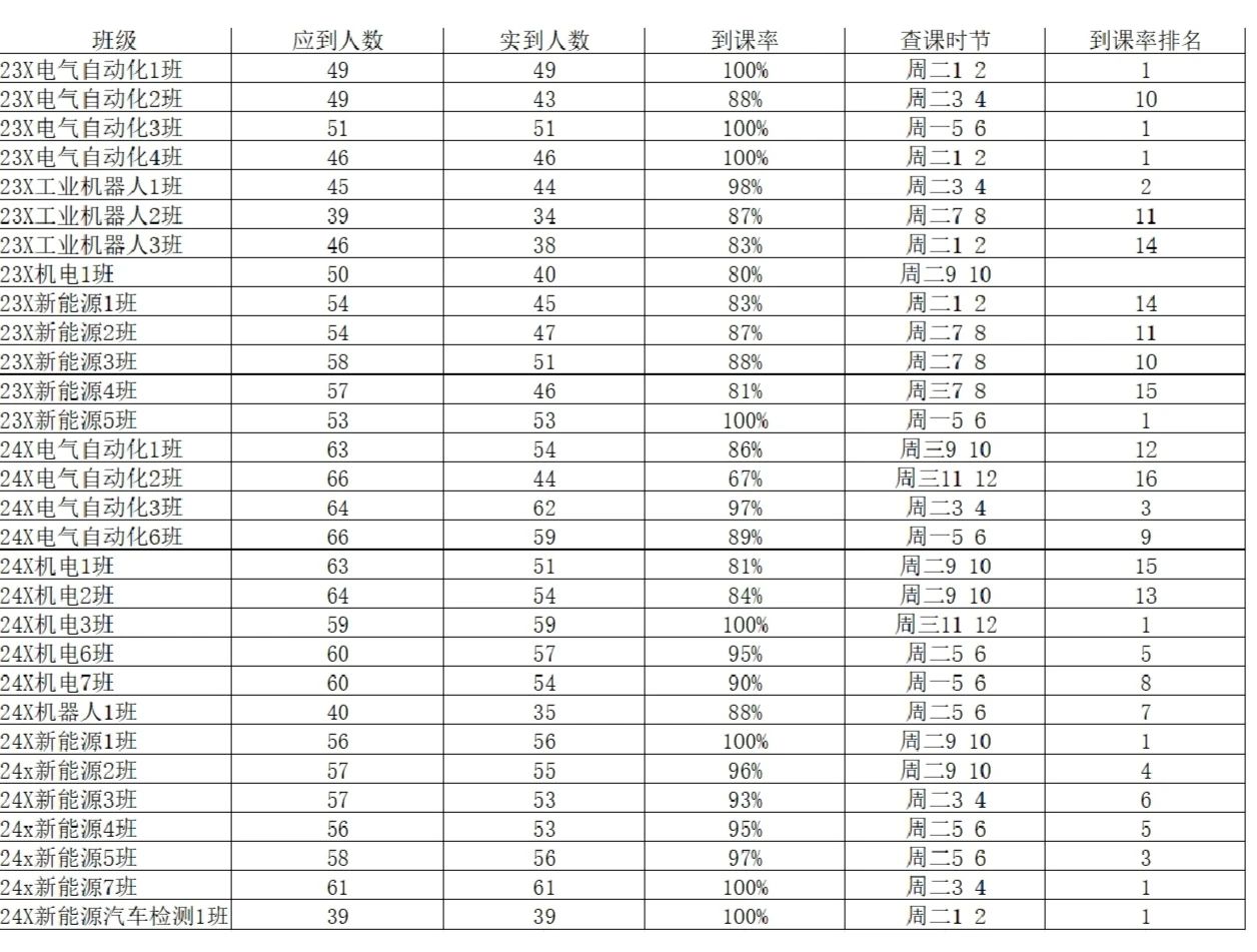 广汉书院团委办公室工作人员对智能制造与汽车学院(江门校区)第六周的学生课堂情况和学生到课率进行了统计。现将第六周的查课数据汇总结果给予公布。