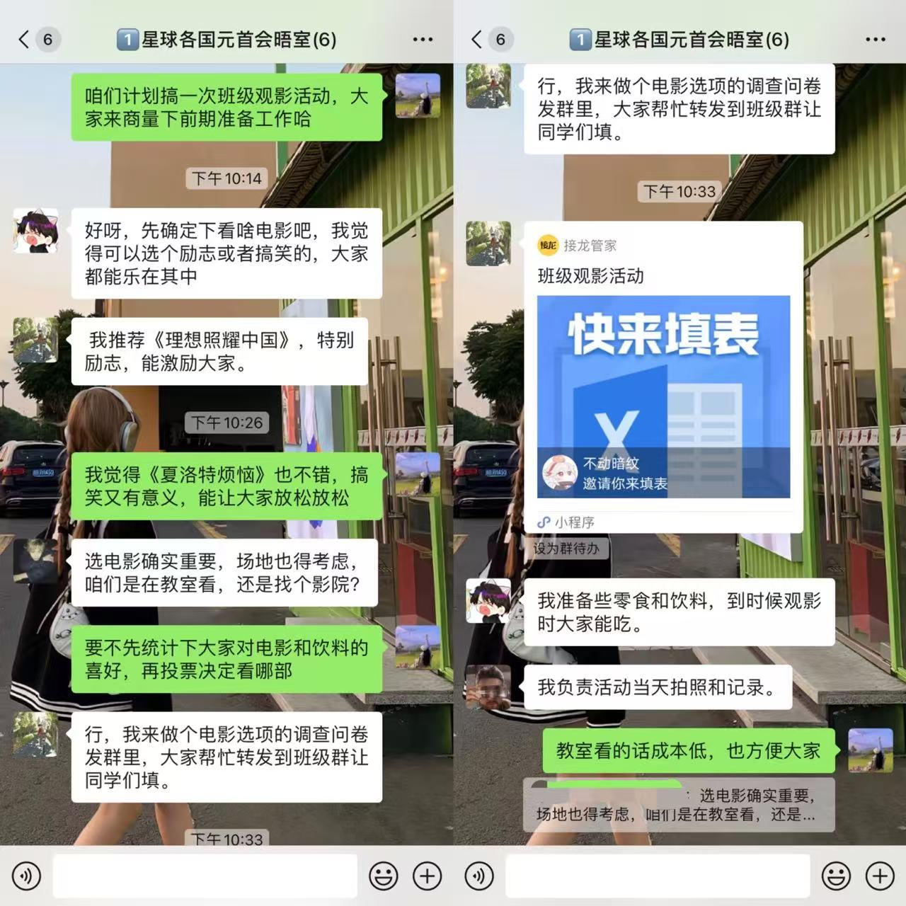 这次观看红色电影《理想照耀中国》的活动,是班级建设中的一次重要实践。它让同学们在共同的体验中,增进了彼此之间的了解和信任,增强了班级的凝聚力和向心力。奶茶和零食虽小,却为活动增添了温馨的氛围,让同学们在享受美味的同时,也感受到了班级的关怀与温暖。通过感受先辈们的理想信念,同学们更加明确了自己的责任和使命,在班级中形成了一股积极向上、团结奋进的良好氛围。