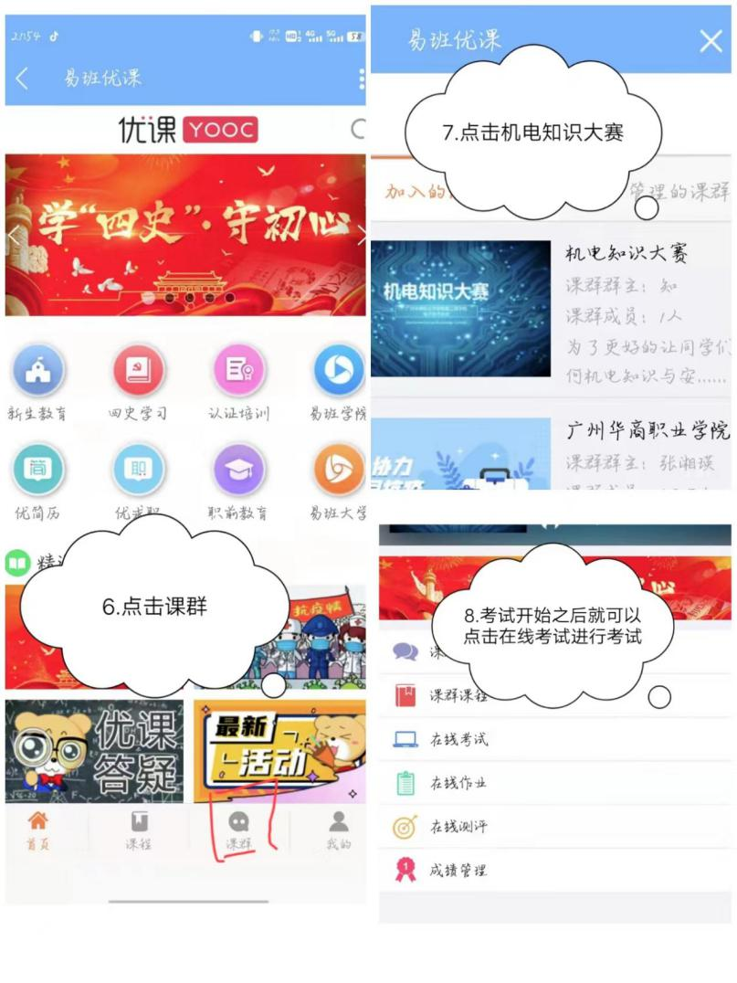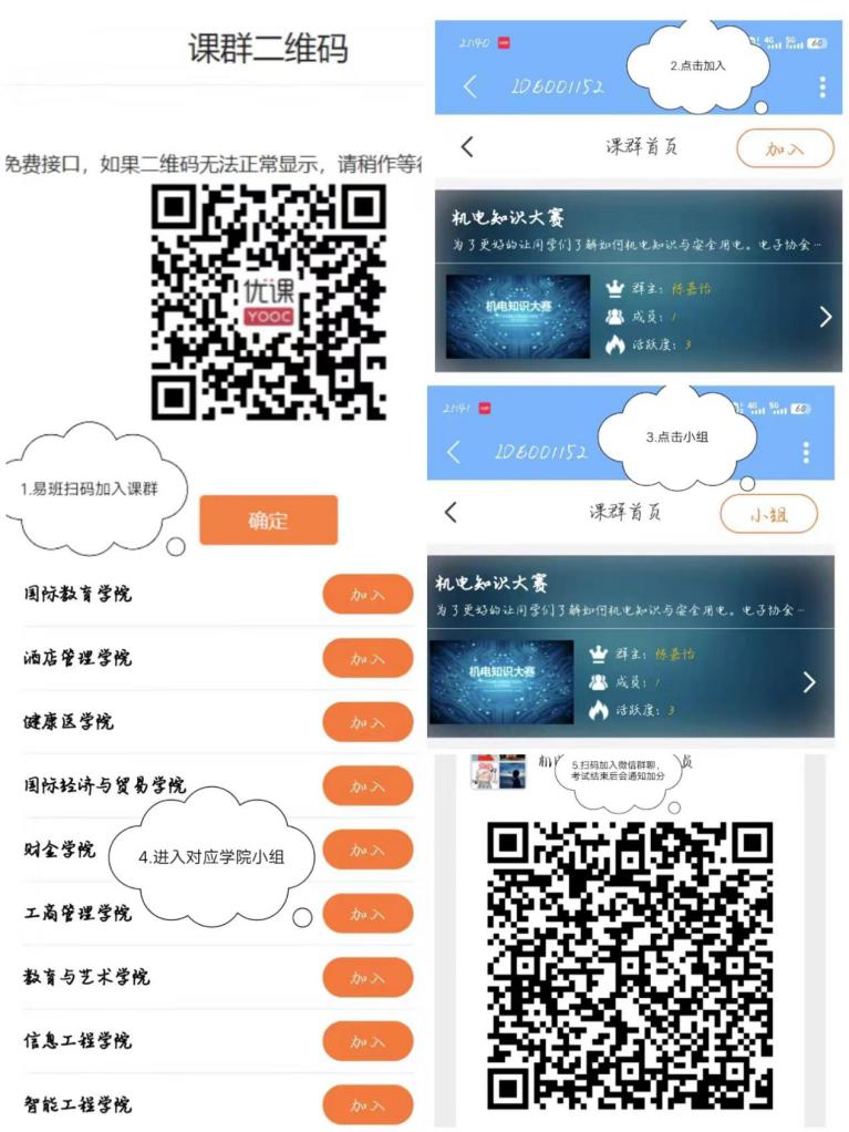 易班操作流程:用易班软件扫描课群二维码→进入对应学院小组→点击加入→点击小组→点击课群→点击机电知识大赛→点击在线考试