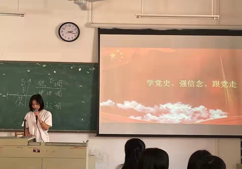 会议伊始,全体同学起立奏唱团歌,铿锵有力的声音响彻整间教室,牵动着每个人的心灵。接着,团支书带领同学从习总书记“七一”讲话中实现“第一个百年奋斗目标、一个主题、四个伟大成就、四个庄严宣告、伟大建党精神、以史为鉴、开创未来、九个“必须”进行学习。