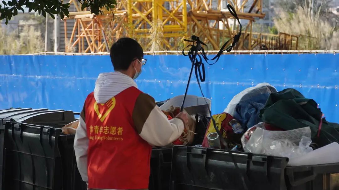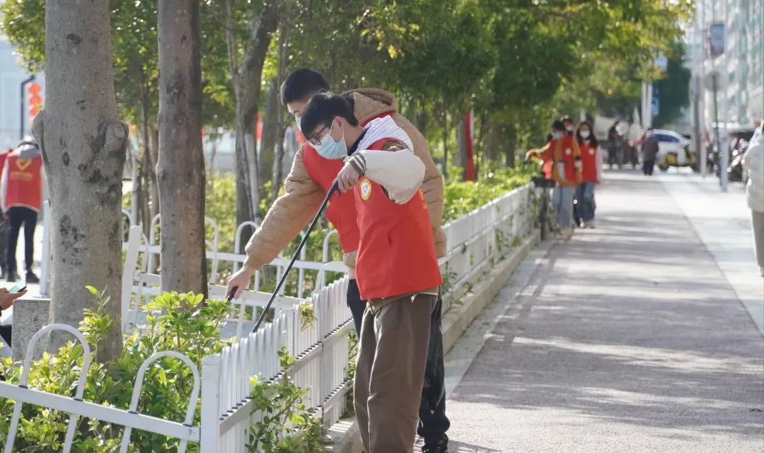 在活动当天,我们身着红马甲、手拿扫把、垃圾铲等工具,沿着河岸徒步捡拾废弃纸巾、塑料袋、烟头、瓶子等垃圾杂物,他们在石板缝中找寻丢弃的烟头、在护栏里捡起花花绿绿的食品包装袋、在花带里捡果皮包装纸……