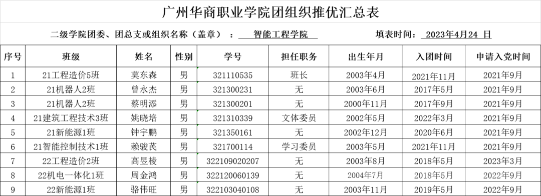 为了激发广大青年团员的政治热情,加强对共青团员的政治引领,增强共青团组织的凝聚力和战斗力,切实保证新发展党员质量,从源头上培养党组织的先进性和纯洁性,不断为党组织培养输送新的血液,根据《共青团“推优”入党工作实施办法(试行)》等有关文件的规定,智能工程学院团委决定开展团推优。经个人申请、各支部依程序召开推优大会,现将智能工程学院2023学年春季学期团推优对象名单公示如下: