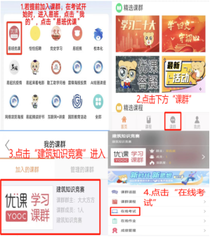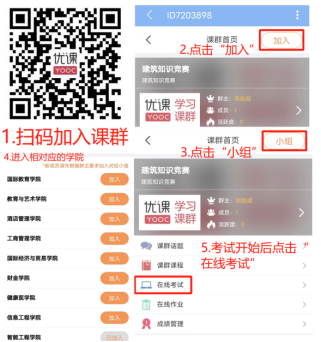 用易班软件扫描课群二维码→进入对应学院小组→点击加入→点击小组→点击课群→点击建筑知识竞赛→点击在线考试(需在考试期间)
