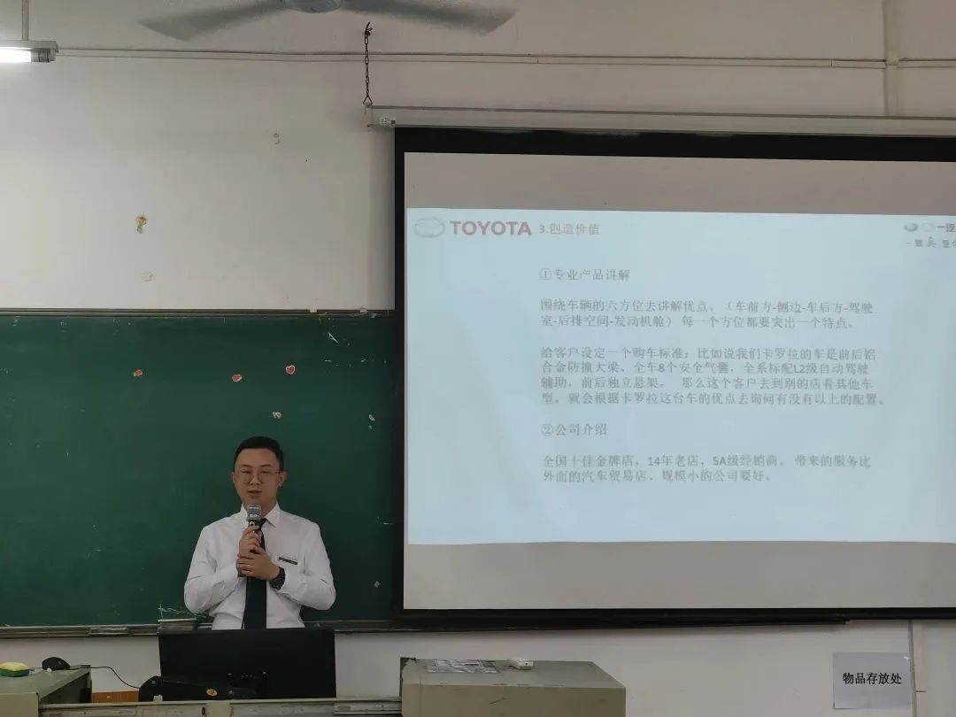 为更好的迎接第二届“智能节”之汽车技能大赛决赛的到来,进一步增强参赛选手的专业素养和技能水平。我院于5月9日下午特邀请广州兆方丰田汽车销售服务有限公司的金牌销售张文铮先生为我们的参赛选手进行一次赛前培训。