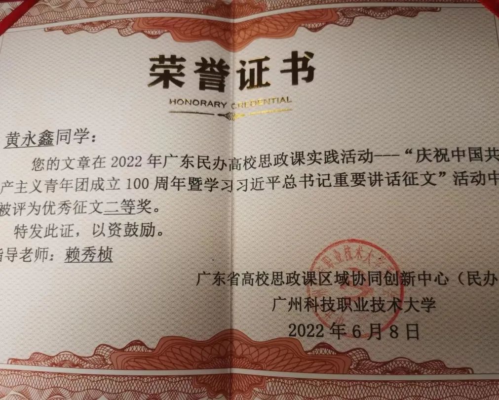 黄永鑫,男,汉族,共青团员,籍贯广东省汕头市人,现就读于广州华商职业学院智能工程学院21工程造价6班。现担任智能工程学院院青年志愿者协会服务部部长、定向越野运动协会副会长、班级心理委员兼生活委员。