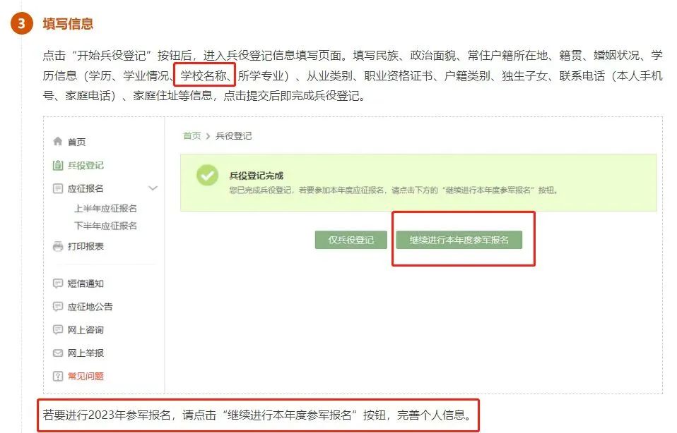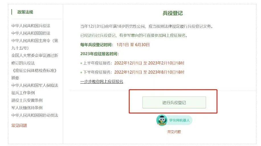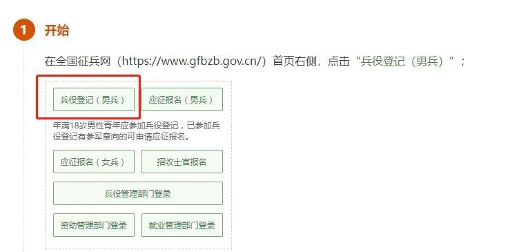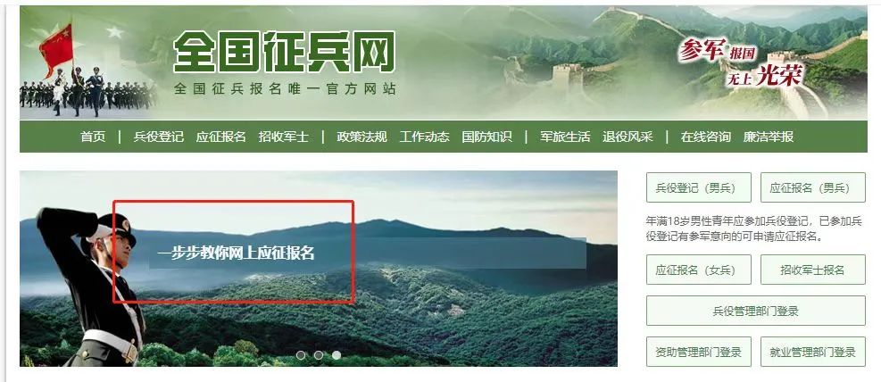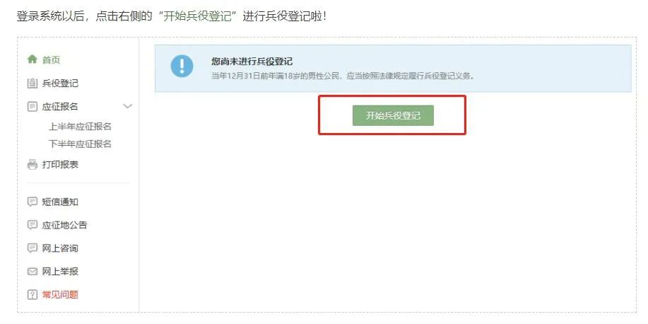 在这个页面中,会告知我们报名时间以及参军的政策说明,建议看后,点击“进行兵役登记”,迈出你军旅生涯的第一步吧!
