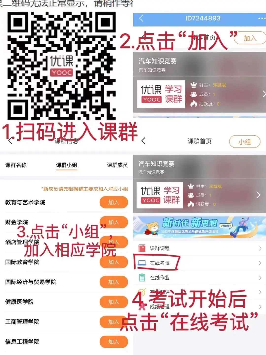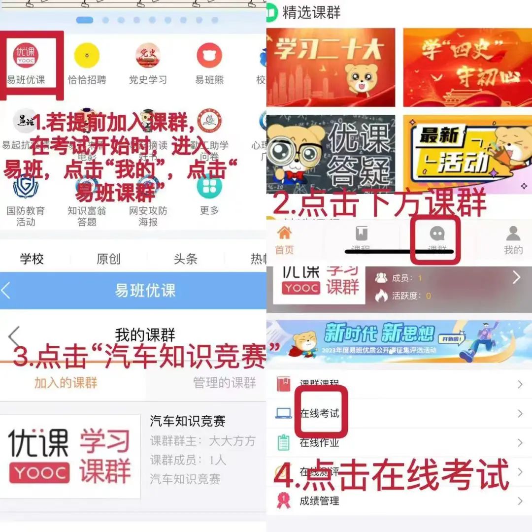 用易班软件扫描课群二维码→进入对应学院小组→点击加入→点击小组→点击课群→点击建筑知识竞赛→点击在线考试(需在考试期间)