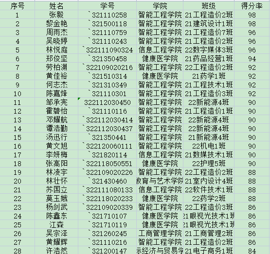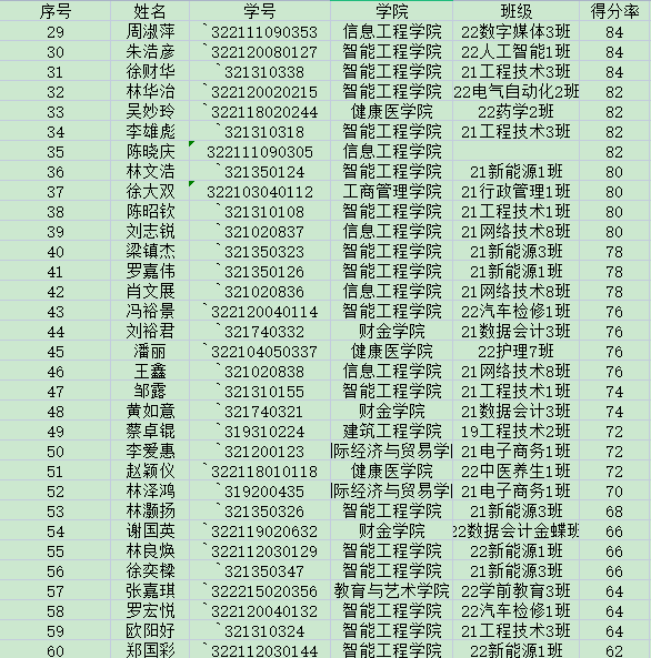 参加本次比赛的同学共有140名,其中,成绩排名前三名的同学破蛹而出,他们以更丰富的知识储备量,以及更研精静虑的比赛状态,取得了本次竞赛的胜利。现公布排名前60名的名单,分数相同用时较短的同学排名优先。