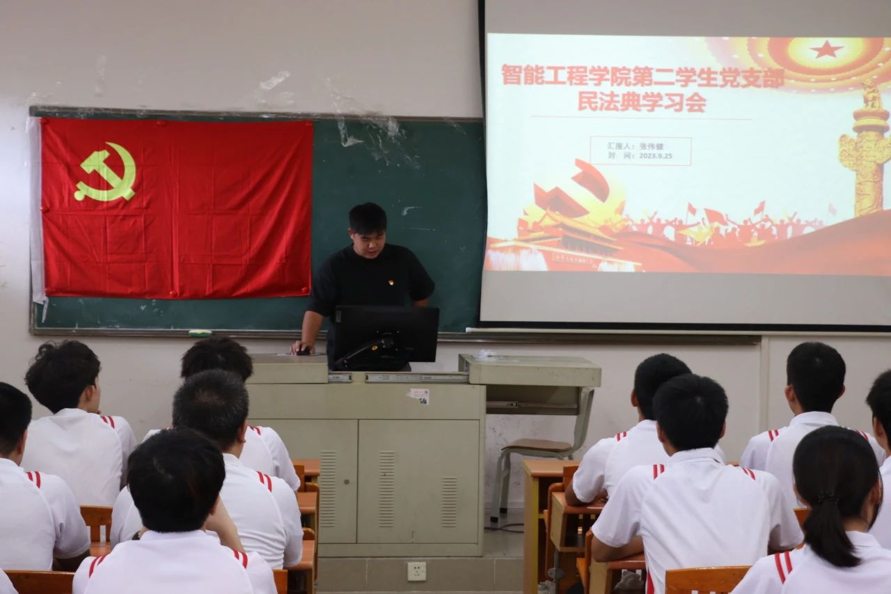 智能工程学院学生第二党支部于9月25日12:20在博学楼C栋506课室开展“三会一课”民法典学习会,出席本次会议的有智能工程学院学生第二党支部宣传委员张伟健老师以及全体学生党员,此次会议由张伟健老师主持。
