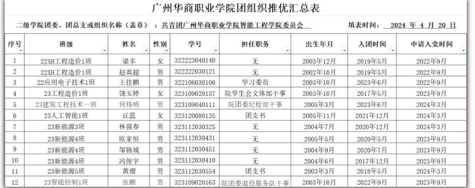 根据中青发〔2019〕9号共青团中央关于印发《共青团推优入党工作实施办法(试行)》的通知文件精神以及《广州华商职业学院关于开展 2024 年秋季学期团员推优工作通知》的要求,经个人申请、各团支部依程序召开“推优”大会、学院团委审核,拟确定推荐王佳鹏等12名共青团员推优入党资格,现予以公示。