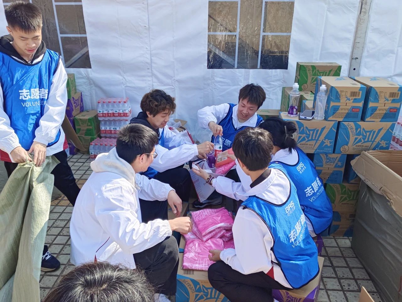紧接着,志愿者们身穿蓝色马甲,分工明确的忙碌起来。每个人将不同的物品分类整理,为参赛者们装好完赛包,确保每一份完赛包内的物资齐全且摆放整齐。