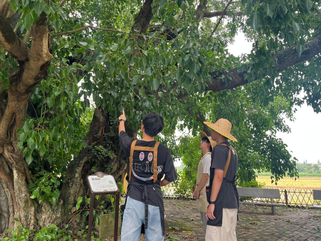 青创筑乡突击队队员在百年菩提树下寻找墙绘灵感,他们从弯曲有力的粗壮树枝中获得勾勒轮廓、表现树木力量的参考,从阳光穿过树叶形成的光影中得到表现空间深度和营造氛围的启发,还从树干粗糙带皱纹的树皮中体会到历史沧桑感,这些都将用于墙绘创作。