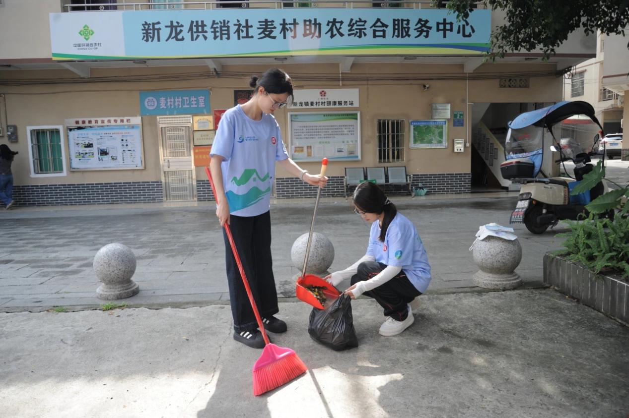 清晨,当第一缕阳光洒在麦村村口的龙眼树下时,“同心燃梦”实践队的队员们已整装待发。他们手持扫帚、簸箕,与麦村清洁工人并肩开启环村清扫工作。队员们分工明确又默契协作:有人专注清理树下腐烂的龙眼,指尖沾了污渍也毫不在意;有人细心清扫满地落叶,连砖缝里的碎屑都不放过;还有人负责清扫路面生活垃圾,推着沉重的簸箕往返于垃圾桶与清扫点之间。日头渐升,汗水顺着队员们的脸颊滑落,浸湿了衣背,可没人喊累。望着干净整洁的柏油路向远方延伸,实践队员们望着自己亲手打扫的村庄,脸上洋溢着青春的热忱,让这个清晨的村庄更添了几分暖意。、