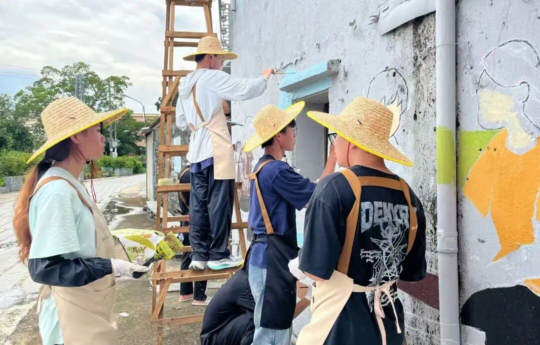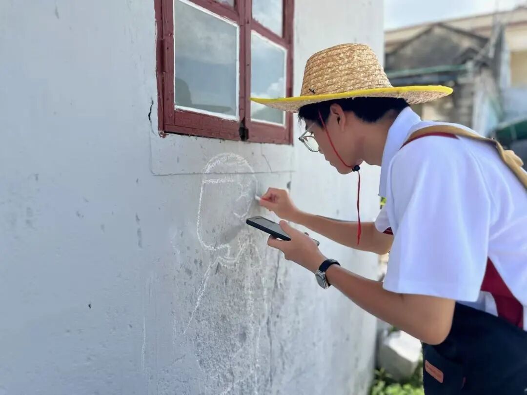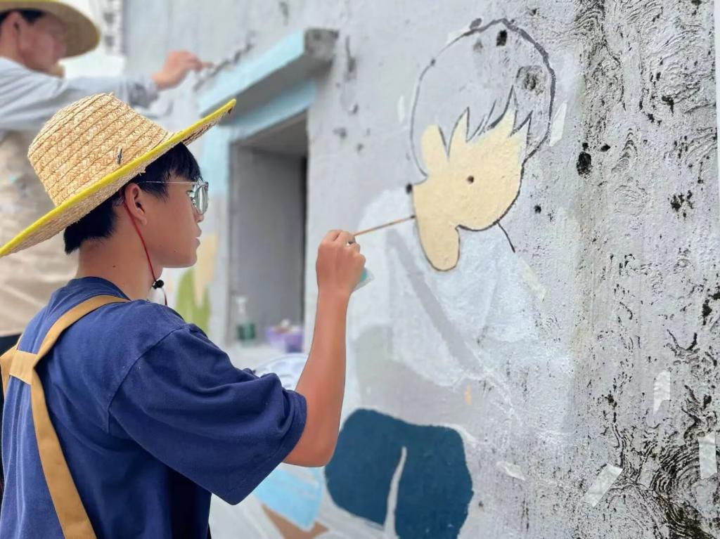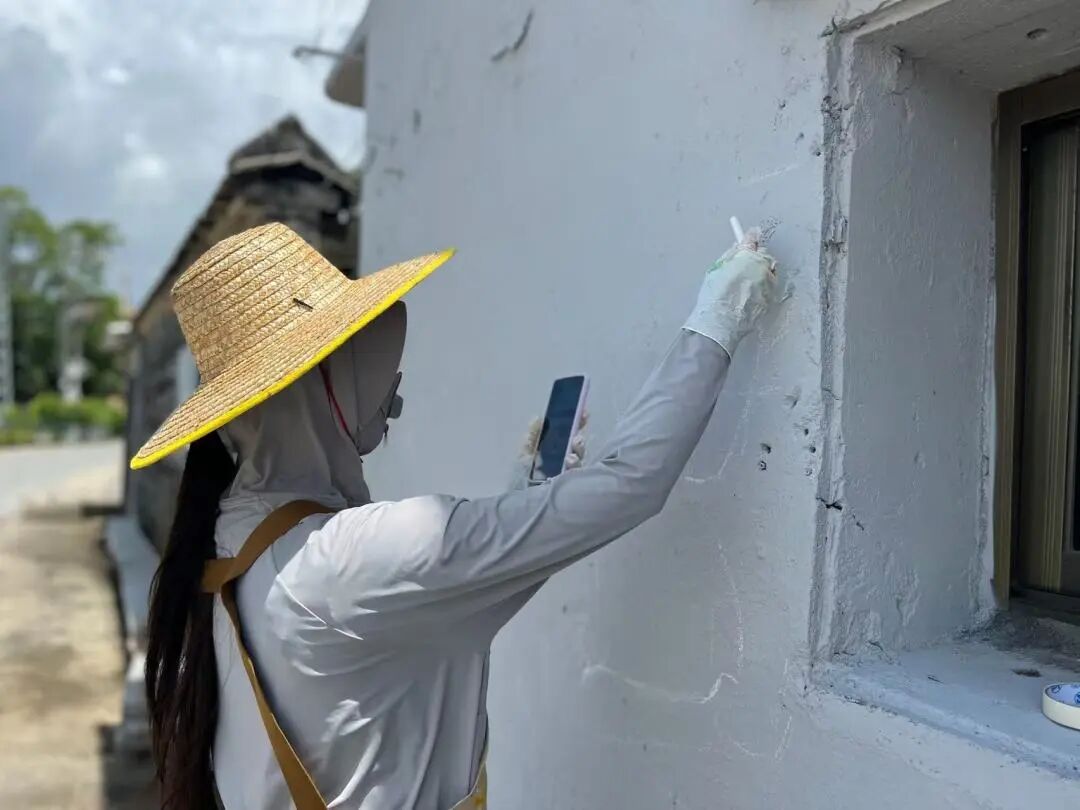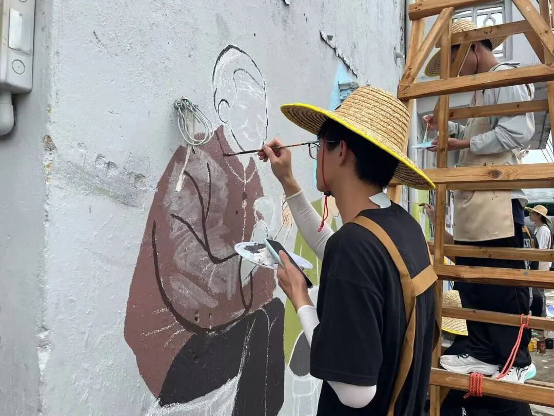 青创筑乡突击队的画笔继续在靖安村挥洒!继前两幅墙绘成功开启后,7月17日,队员们全心投入第三幅主题创作——“菩提树下的甜蜜记忆”。大家以墙为纸,用专注的笔触,让一幅满载乡土温情的画面轮廓,在古老的墙面上渐渐清晰。