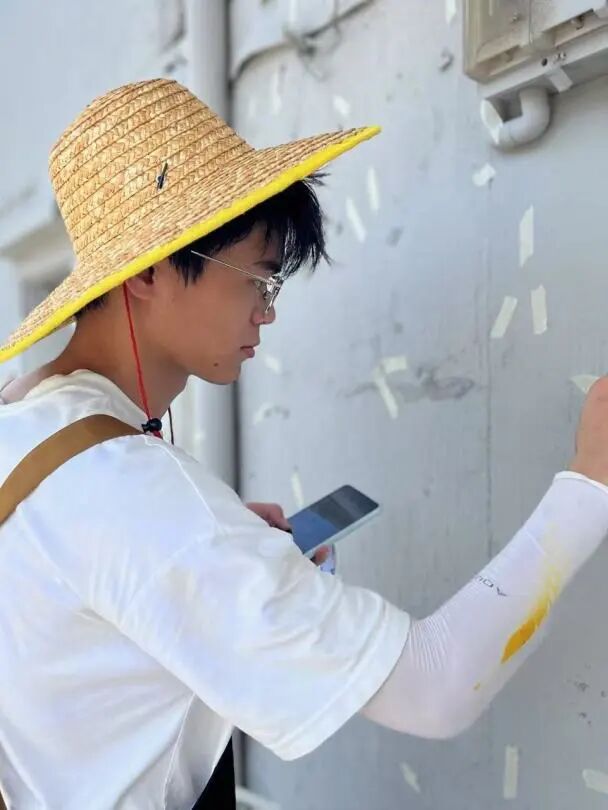 面对大面积的轮廓,队员们分工协作。有人负责勾勒主体结构,有人专注于细节边缘。大家彼此照应,及时传递工具,或帮忙扶着梯子,确保勾线工作安全高效地进行。阳光照在刚画好的墨线上,显得格外分明有力,为后续的上色打下了坚实的基础。