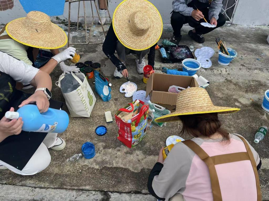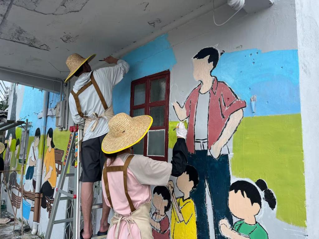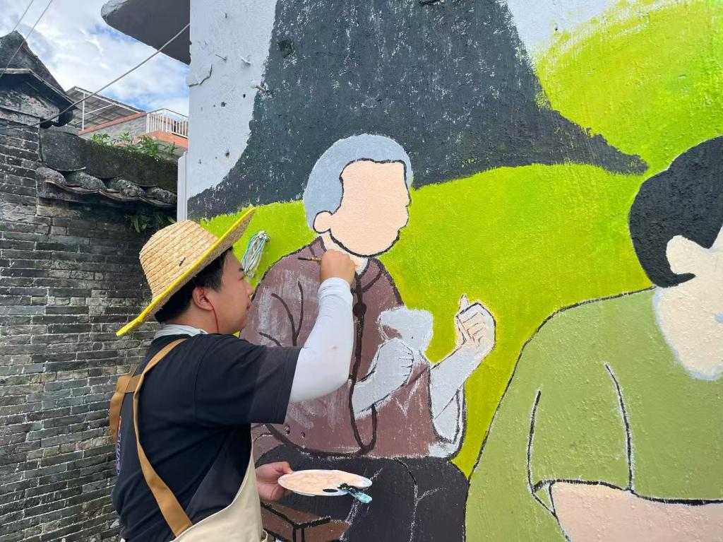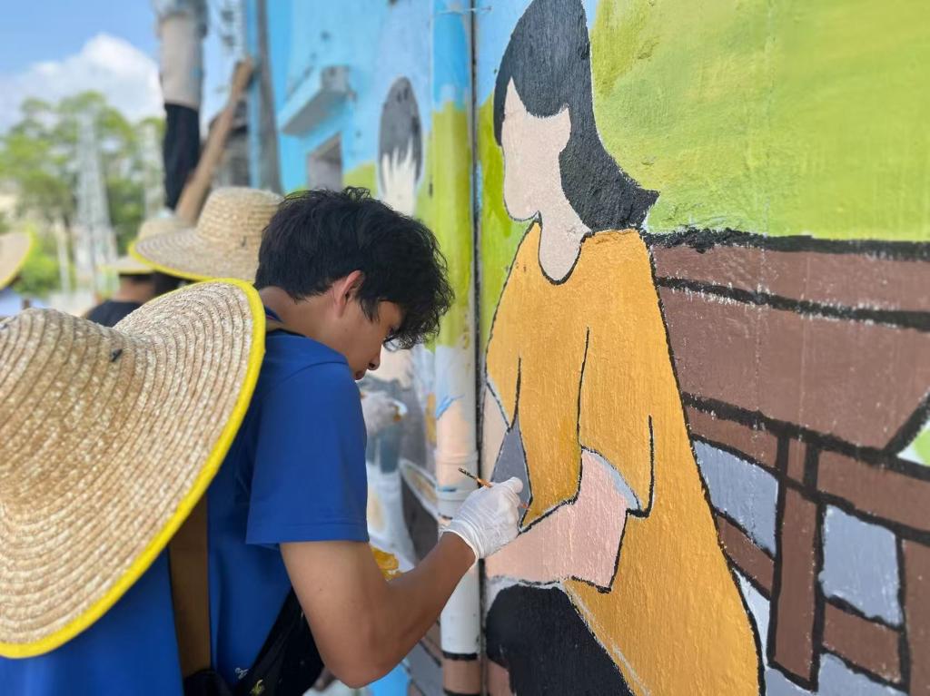清晰的墨线已在靖安村的墙面上扎根,静待色彩的绽放。7月18日,青创筑乡突击队队员们手持调色盘与画笔,为第三幅主题墙绘——“菩提树下的甜蜜记忆”注入斑斓的生命力。颜料与汗水交织,一幅充满烟火气的乡村图景正缓缓铺陈开来。