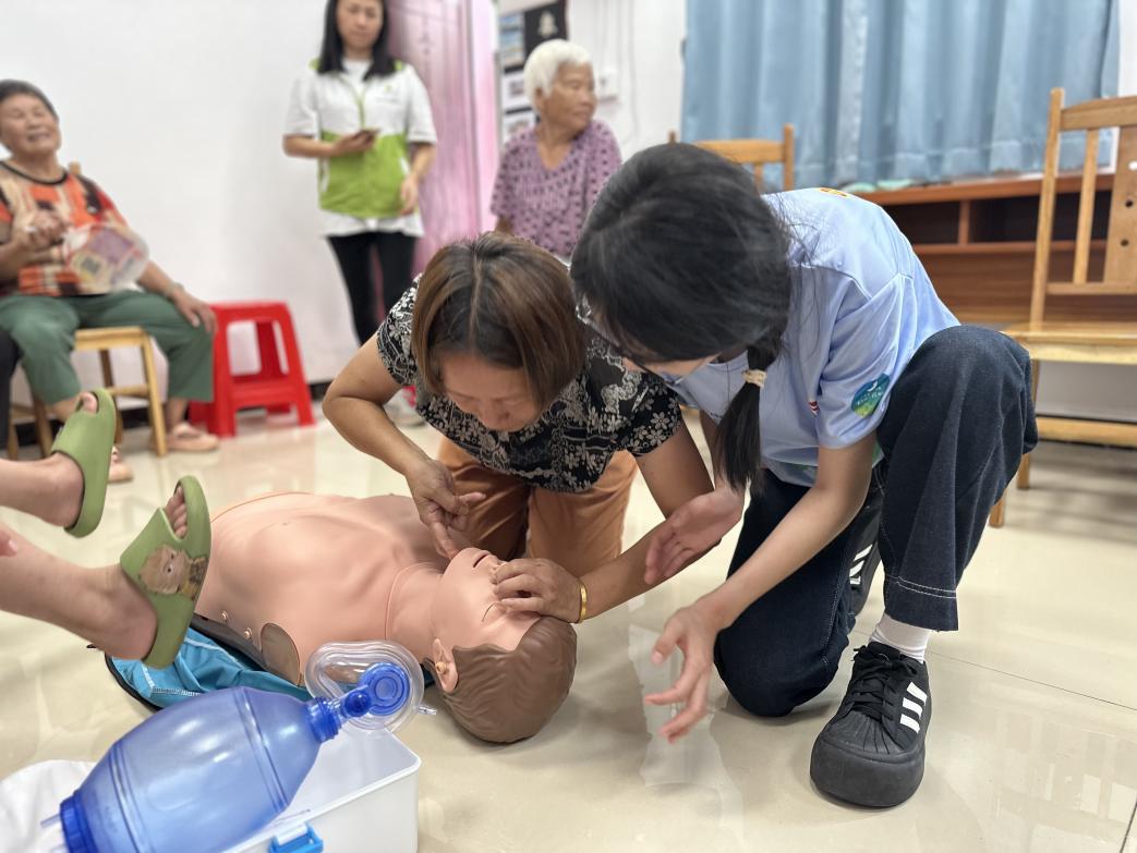 室内,急救培训火热开展。队员协助村民操作模拟人,讲解心肺复苏、人工呼吸要点。从生疏到熟练,村民们认真学习,这是为乡村安康增添一份保障,让“急救守护”的种子在乡村扎根。