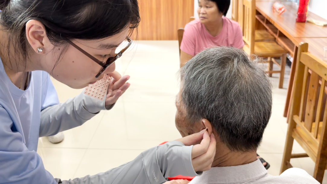 艾灸体验环节,队员为老人施灸,讲解养生知识。传统中医技法在乡村落地,温热的不仅是身体,更是传承与守护的心意,让古老智慧赋能乡村健康生活。