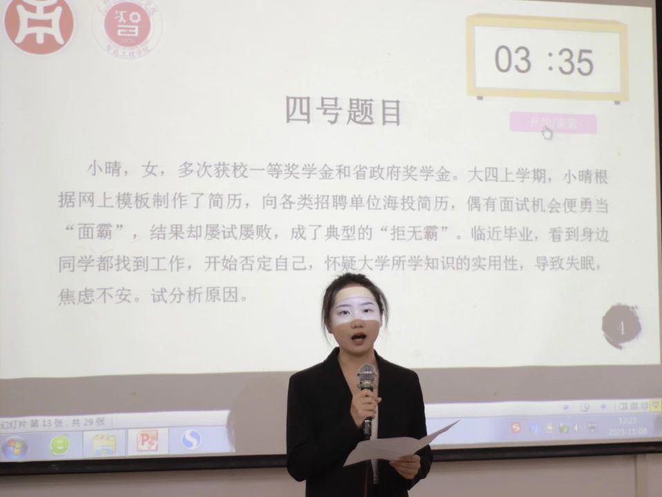 选手以PPT形式陈述个人求职意向和职业准备情况,展示通用素质与岗位能力。在主题陈述还有1分钟及30秒时,工作人员会举牌提醒,超时1分钟扣5分,不足1分钟按1分钟算。