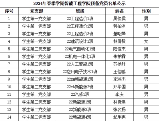 根据《中国共产党发展党员工作细则》的工作要求,经党组织培养、教育和考察并广泛征求群众意见,智能工程学院学生第一党支部、学生第二党支部研究及讨论表决,报学院党总支审核同意,拟接收吴俊儒等14名同志为中共预备党员,现将名单予以公示。