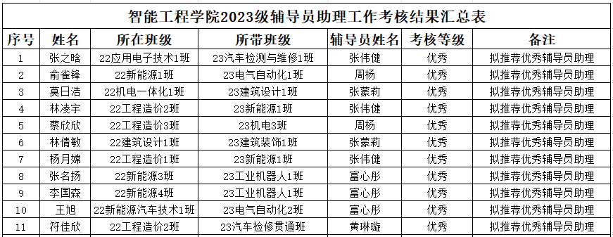 智能工程学院2023级新生辅导员助理,在学院领导及辅导员的悉心指导下,始终秉持着卓越的服务理念,恪守岗位职能,积极投身于辅导员的各项辅助工作之中。为表彰表现杰出的同学,树立学习的典范,根据《广州华商职业学院新生辅导员助理管理办法》的相关规定,并结合我院的实际情况,经过助班所带班级学生评价,辅导员助理的互评以及辅导员的初步审核和学院的复审等严格程序,我们计划推荐张之晗等11位同学荣获“广州华商职业学院优秀辅导员助理”称号。现在,我们将考核结果公布如下,以示公正与透明。