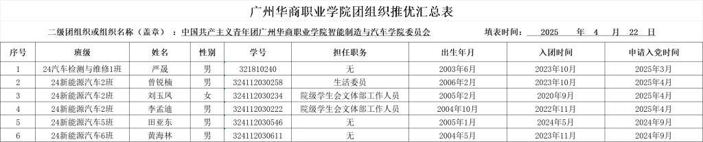 根据中青发〔2019〕9号共青团中央关于印发《共青团推优入党工作实施办法(试行)》的通知文件精神以及《广州华商职业学院关于开展2025年春季学期团员推优工作通知》的要求,经个人申请,各团支部依程序召开“推优”大会,经学院团委审核,拟推荐刘玉风等6名共青团员推优入党资格,现予以公示。