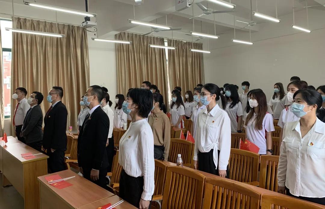 7:40,校本部的师生党员已在博学楼C506课室集合完毕,着装整齐、佩戴党徽、手举红旗,等待着大会的开始。伴随着庄严肃穆的国歌声,现场人员全体起立,向着大屏幕里升起的五星红旗行注目礼。