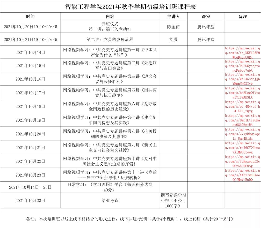 为践行党的初心和使命,使大学生端正入党动机,牢记党的宗旨,增强自身党性修养,进一步了解中国共产党的精神内涵以及先进性。2021年10月14日至2021年10月23日,智能工程学院开展2021年秋季学期初级党课培训。