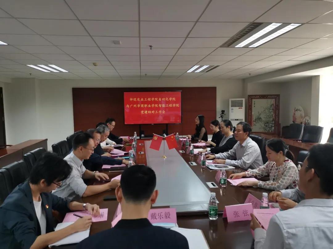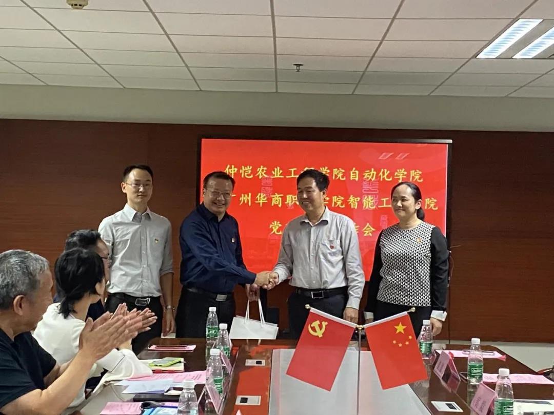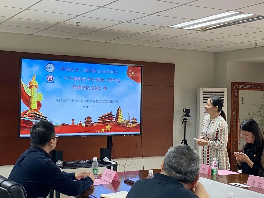 2021年10月27日下午,仲恺农业工程学院自动化学院党委书记刘新周一行七人到我院参加党建结对工作会。参加本次会议的有:仲恺农业工程学院自动化学院党委书记刘新周、党委副书记黄毅以及学院党务工作者,广州华商职业学院党委书记翁礼成教授、广州华商职业学院智能工程学院院长黄河、党总支副书记何标以及学院党务工作者,本次会议由何标副书记主持。