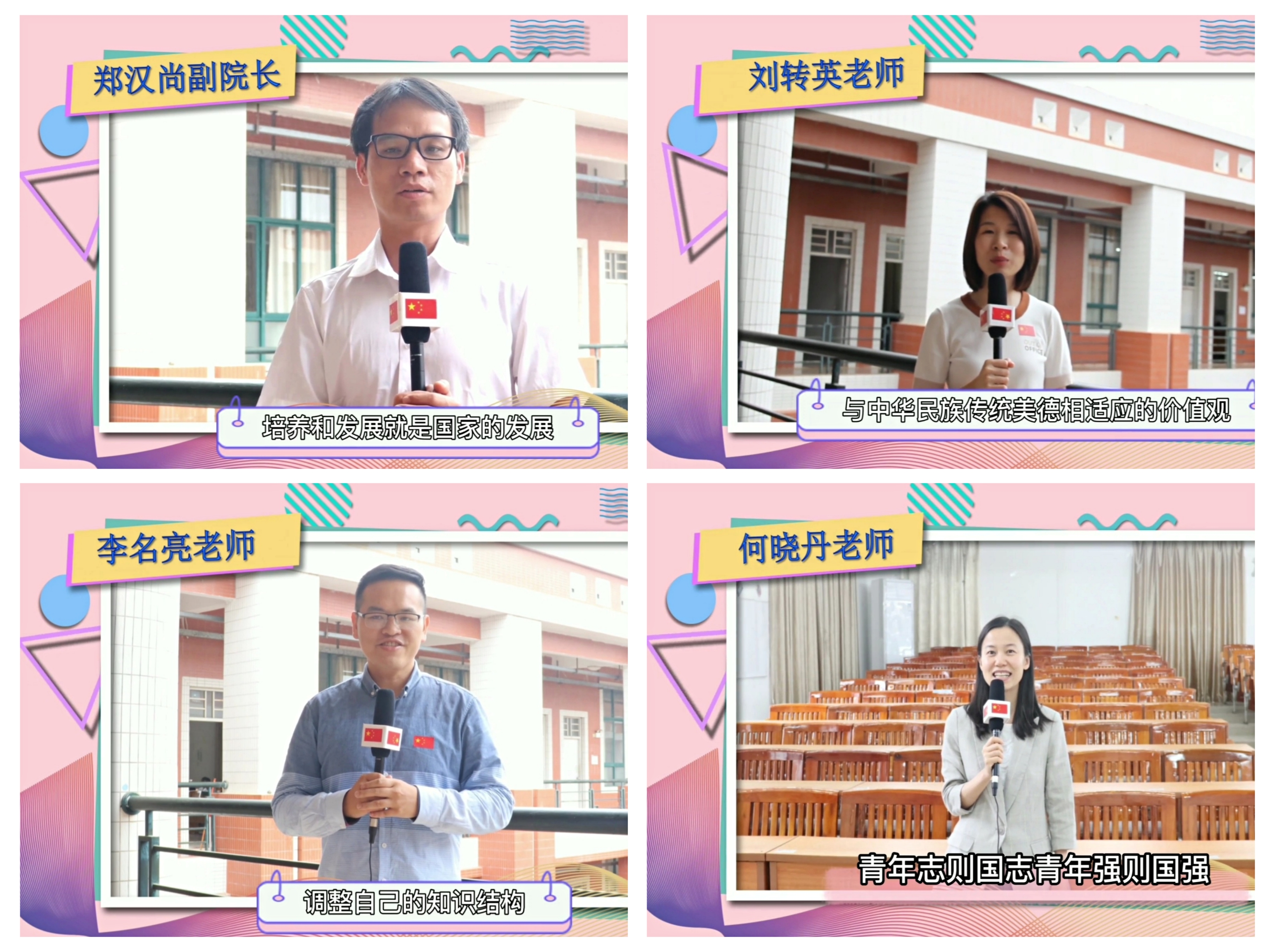 通过老师们的寄语,我们认识到青年大学生在校期间学好专业知识的同时更应该塑造健全的人格,高尚的品德,把个人前途与国家命运紧密结合在一起。将五四精神武装头脑,指导实践,焕发出青年一代应有的朝气。