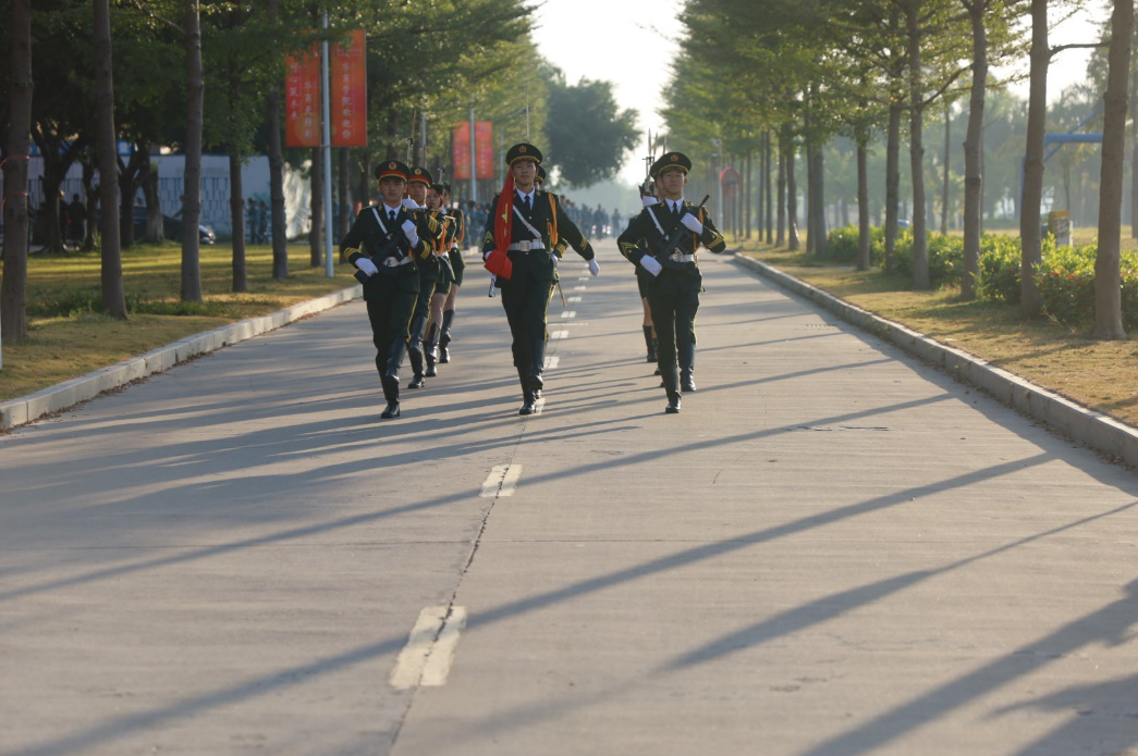 在激昂国歌的旋律下,升旗手振臂一挥,鲜艳的五星红旗徐徐展开,在初升的阳光映照下、学院师生的注目中,迎着初升的太阳,在晨曦中迎风飘扬在上空。