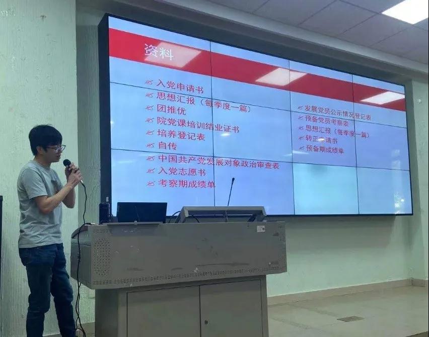学生党支部书记郭梓锋老师向在座的同学讲述了“大学生入党流程”,让同学们更清楚地了解大学期间入党的要求和过程。最后,学生党支部书记郭梓锋老师希望提交入党申请书的同学们树立崇高理想,端正入党动机,做到在思想上、行为上入党,最终实现组织上入党,争做新时代青年!
