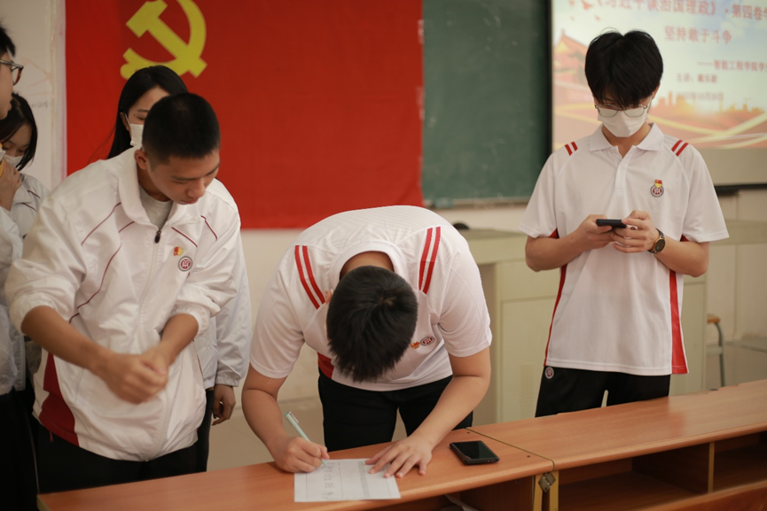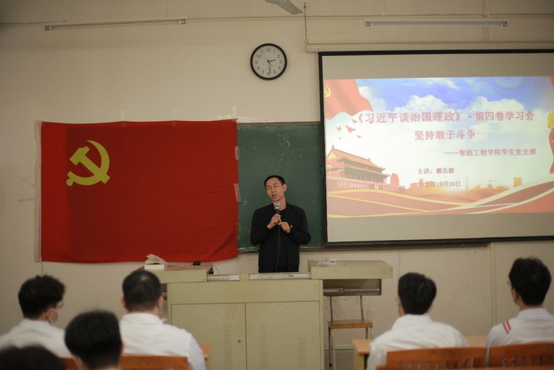 智能工程学院学生党支部于10月20日中午12点30分在博C507展开此次学习活动,由智能工程学院戴乐毅老师主讲,智能工程学院全体学生党员及党务团干部列席。此次活动从《习近平谈治国理政》第四卷:坚持敢于斗争内容展开学习。