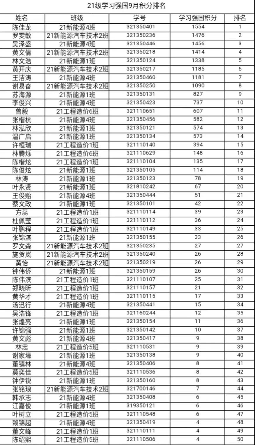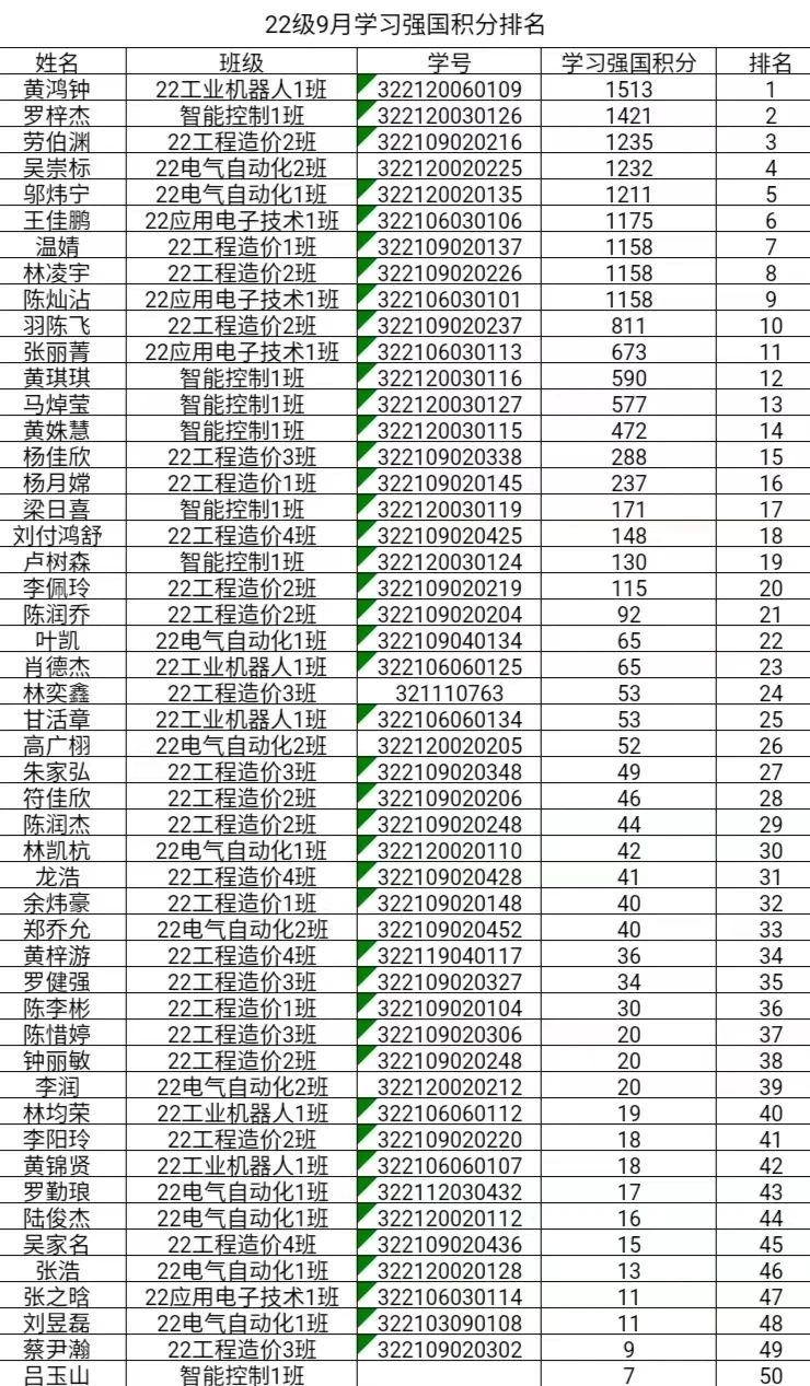 为进一步学好用好“学习强国”学习平台,扎实增进我院学子理论修养、提高思想觉悟、涵养理想信念,智能工程学院将以“学习强国”积分情况为依据,每月持续推出学习强国积分排行榜,对学习积分优秀的同学进行亮晒,激励引导我院全体学生爱学、善学、勤学的热情,让“学习强国”成为以学促干、以学促用的理论宝库,让“强国有我”的理念深入人心。