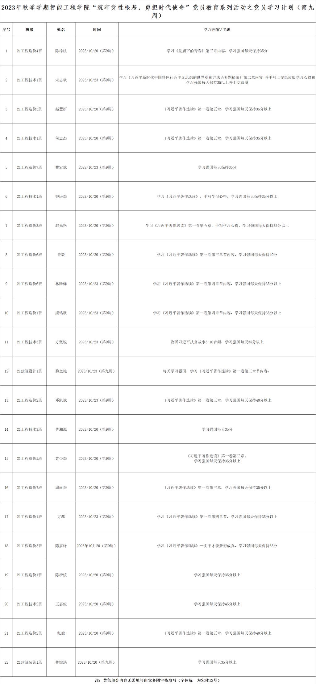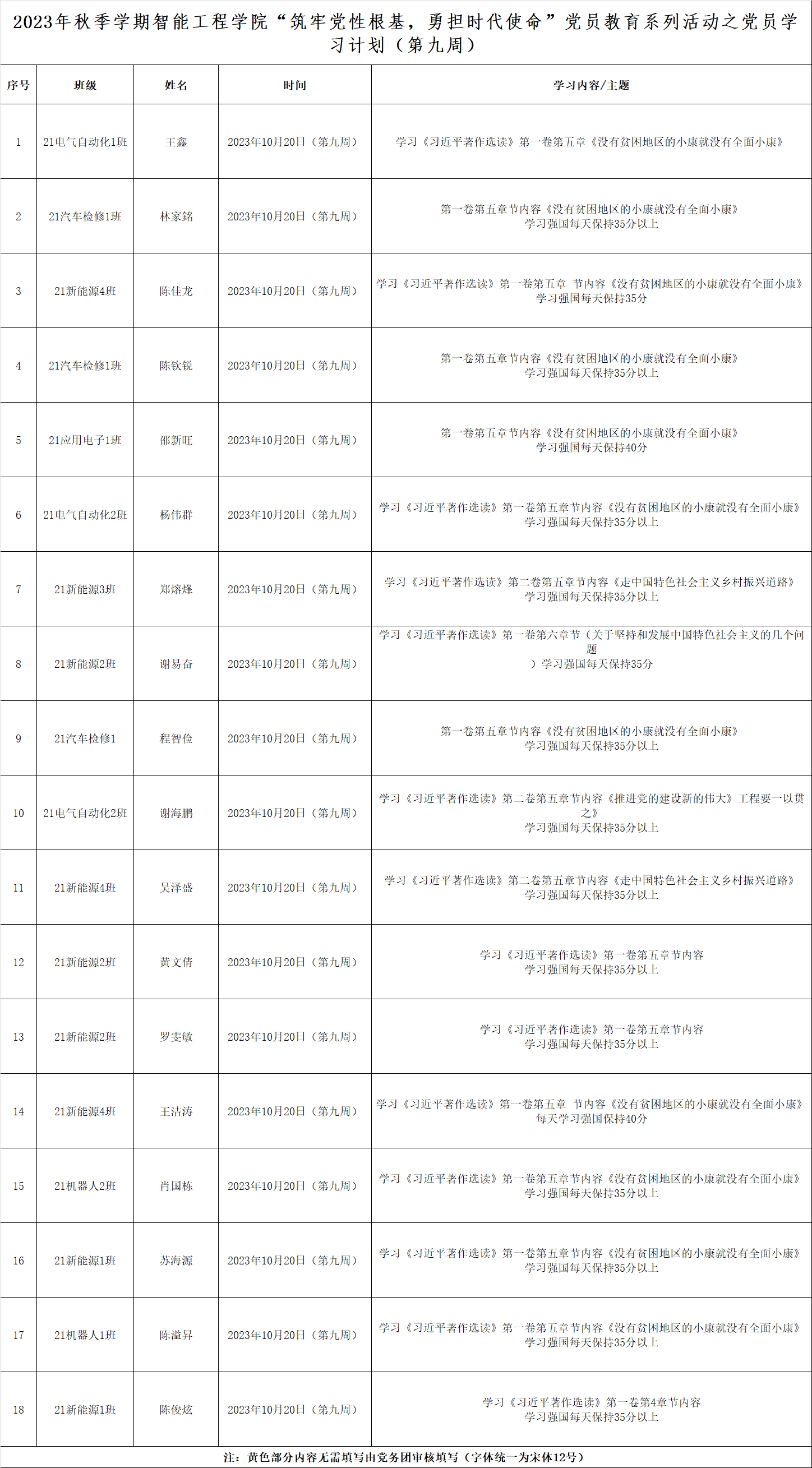 为深化党员的自我教育管理模式,切实提升党员自我教育管理实效,智能工程学院党总支针对现阶段党员教育管理不足现状,积极探索,组织开展党员自我教育学习活动,锚定学习目标,认真贯彻落实,狠抓推进整改,抓好奖励惩罚。现将第九周党员学习计划及检查结果公布如下。