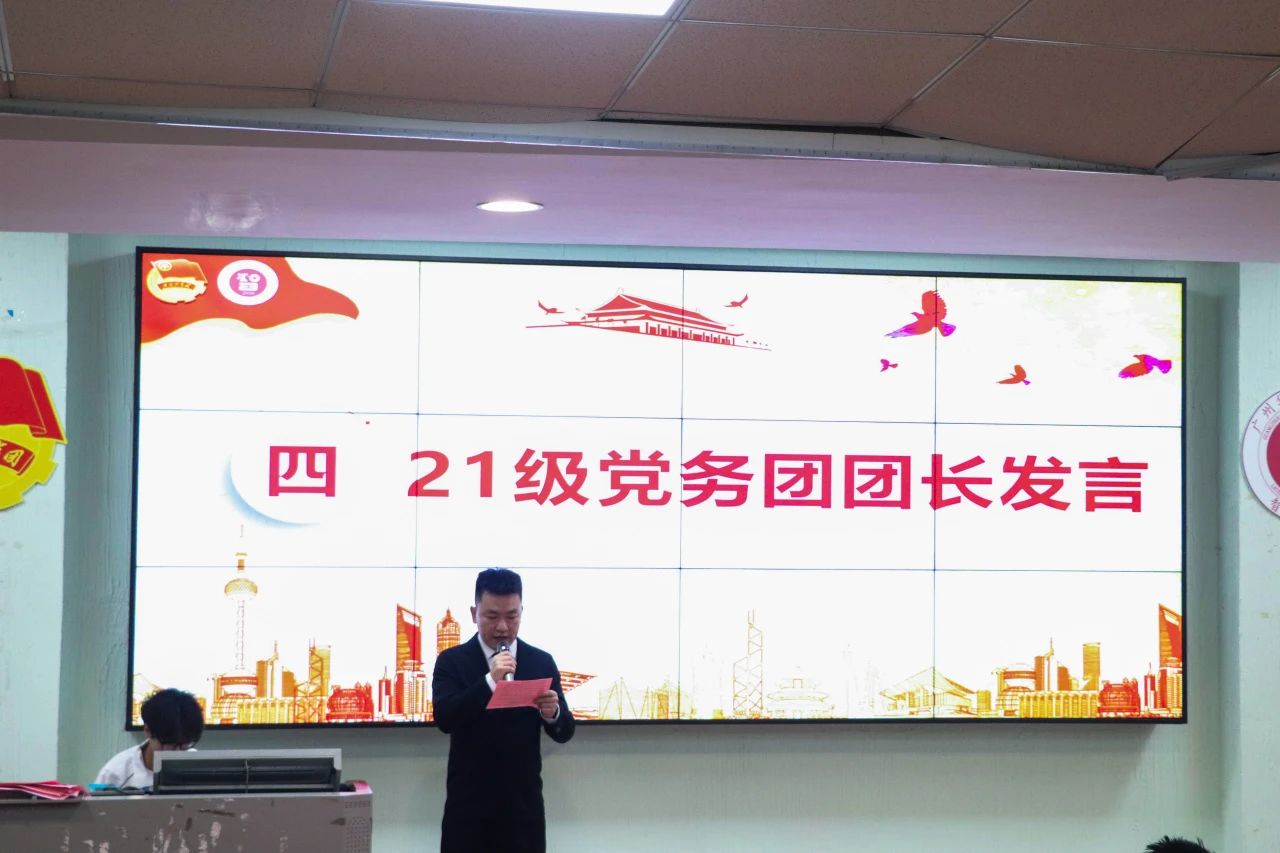 21级党务团团长曹湘源发言回顾过去学院党务团的工作和心路历程,对老师们的指导和全体干事的付出表示感谢。回首过去一年的辛苦与付出,展望未来,他提出以下三点要求,一是提升业务能力;二是提前规划目标;三是提升个人综合素质。党务团是一个大家庭,他希望各个部门之间加强联系共同进退,为学院党建工作与校园和谐文化建设添砖加瓦。
