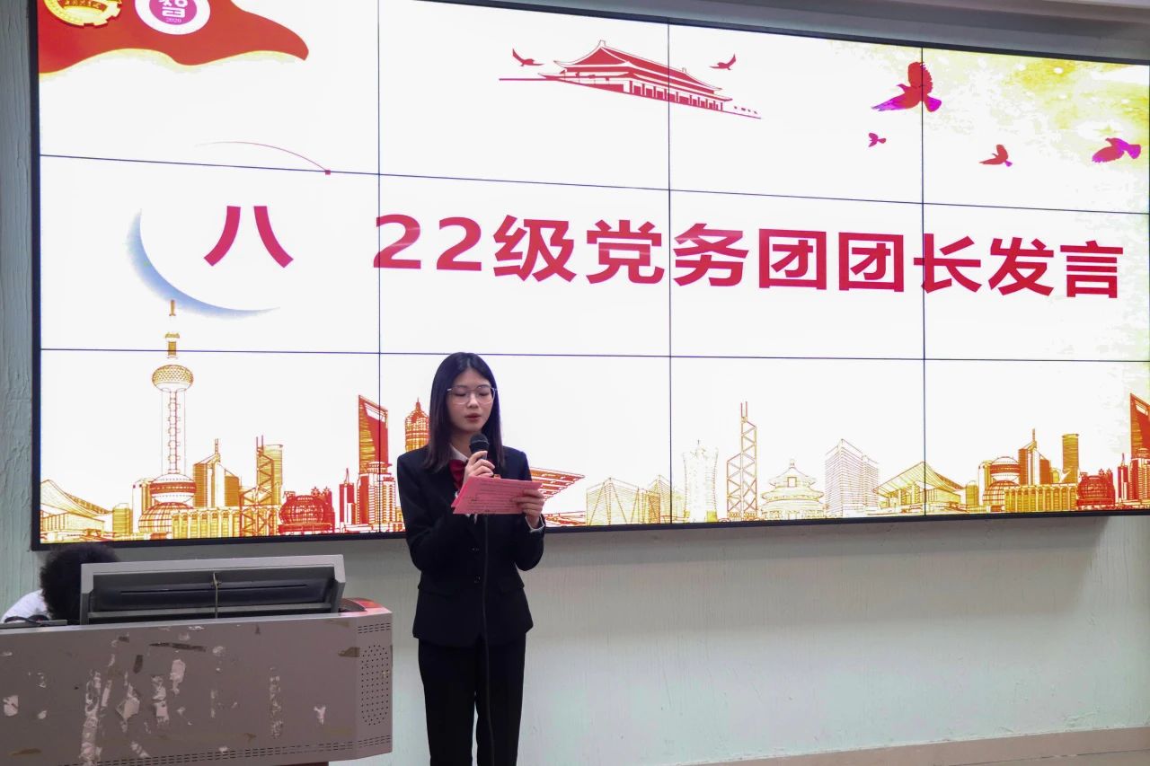 由新任党务团团长羽陈飞的发言,她向上任党务团干部一直以来的辛苦付出表示感谢,同时也向新任干部与干事提出四点要求:一是准确定位学生身份,以保证学业为基础前提,做好党务工作;二是明确职责,分工协作,提高团队意识和组织协调能力;三是熟悉党务团工作的具体业务,确保党务工作顺利开展;四是提高服务意识,服务师生、服务班级,发挥示范引领作用。