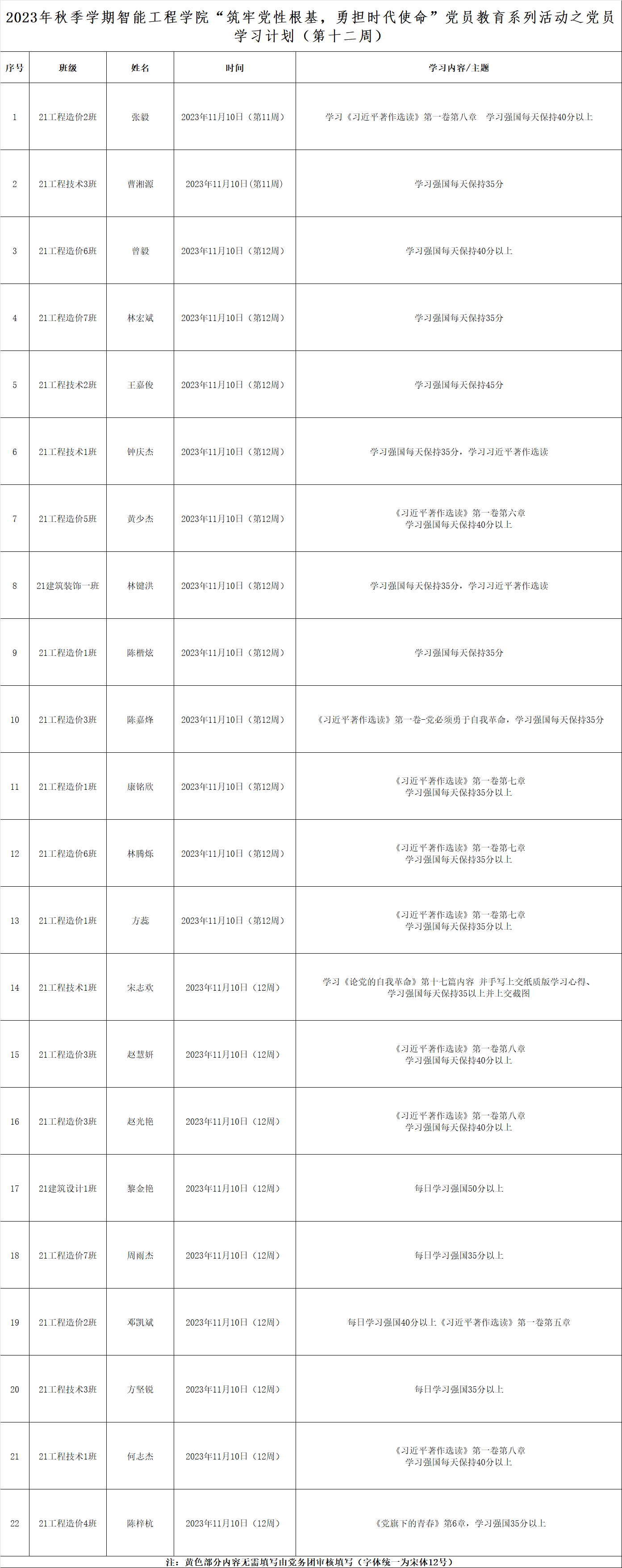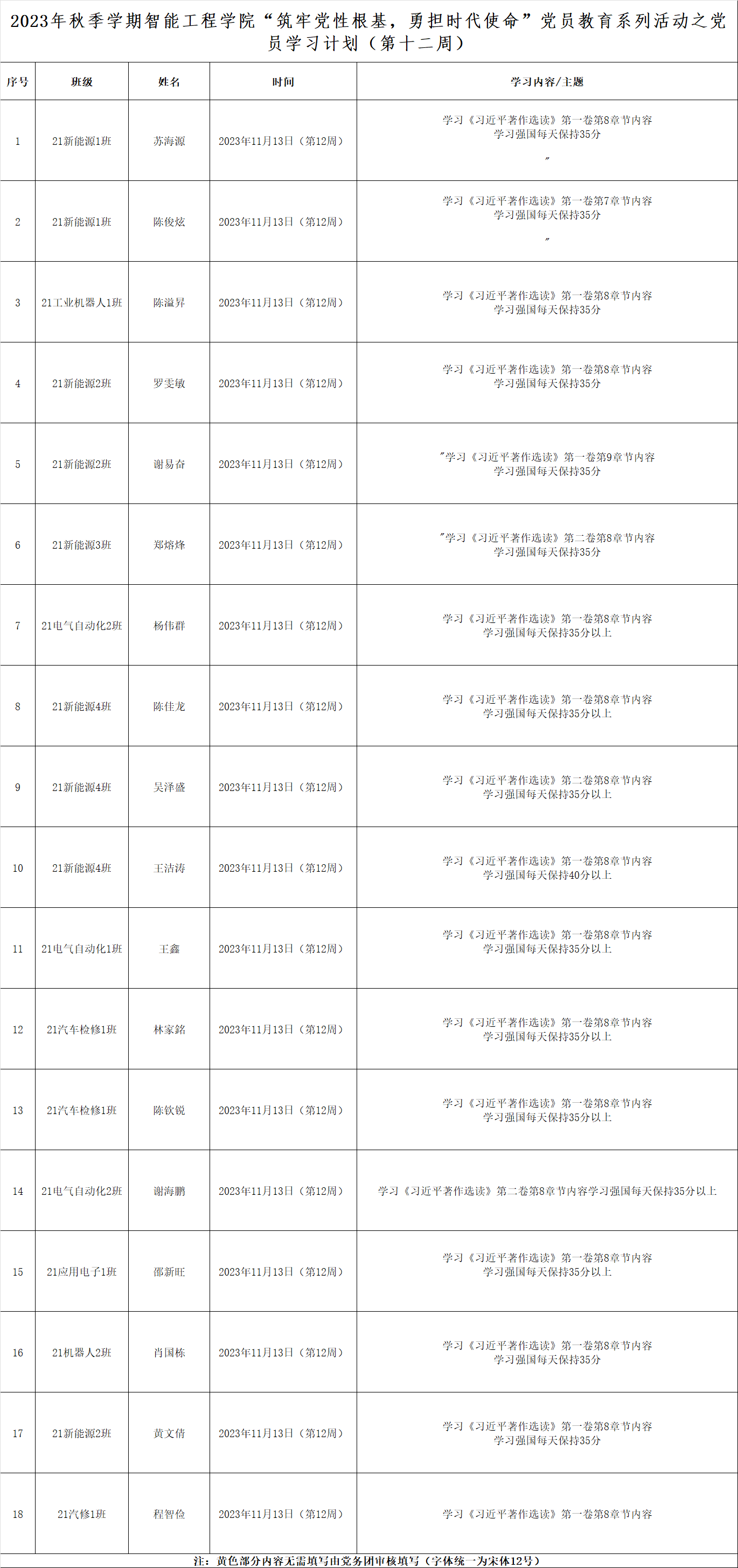 第十二周学生党员学习计划表