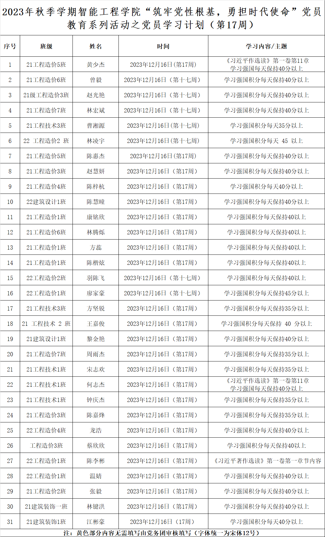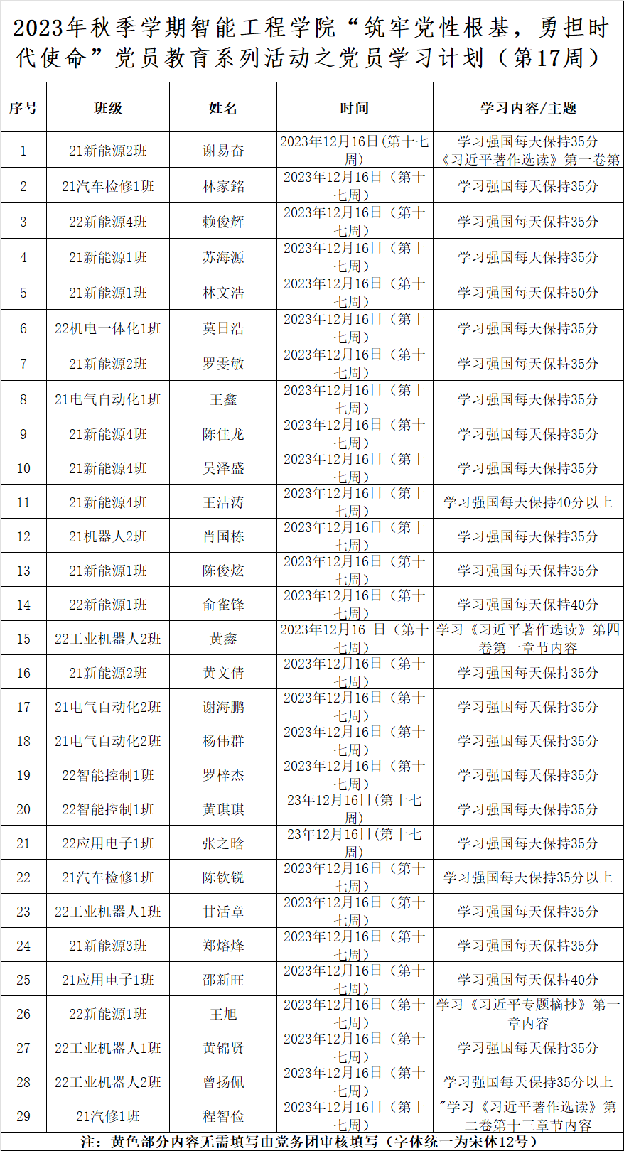 为深化党员的自我教育管理模式,切实提升党员自我教育管理实效,智能工程学院党总支针对现阶段党员教育管理不足现状,积极探索,组织开展党员自我教育学习活动,锚定学习目标,认真贯彻落实,狠抓推进整改,抓好奖励惩罚。现将第十七周党员学习计划及检查结果公布如下。