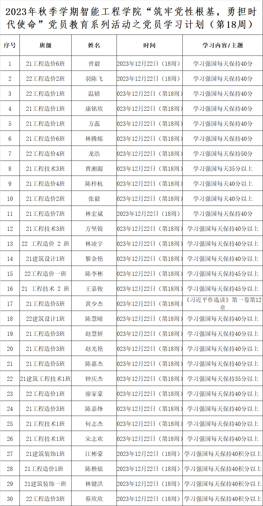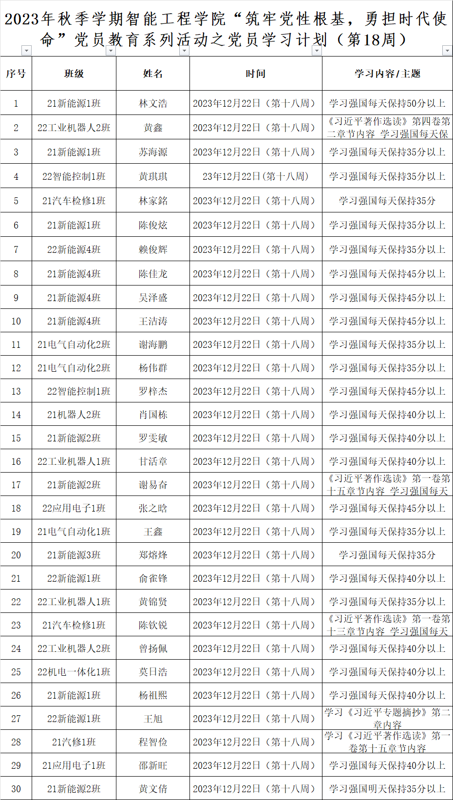 为深化党员的自我教育管理模式,切实提升党员自我教育管理实效,智能工程学院党总支针对现阶段党员教育管理不足现状,积极探索,组织开展党员自我教育学习活动,锚定学习目标,认真贯彻落实,狠抓推进整改,抓好奖励惩罚。现将第十八周党员学习计划及检查结果公布如下。