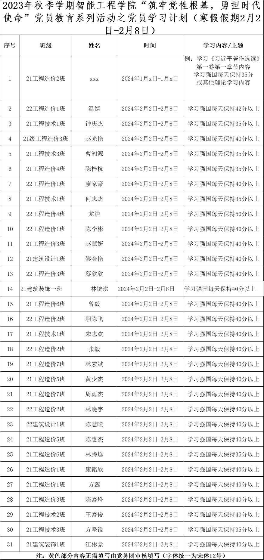 为深化党员的自我教育管理模式,切实提升党员自我教育管理实效,智能工程学院党总支针对现阶段党员教育管理不足现状,积极探索,组织开展党员自我教育学习活动,锚定学习目标,认真贯彻落实,狠抓推进整改,抓好奖励惩罚。现将寒假假期(2月2日——2月8日)党员学习计划及检查结果公布如下。