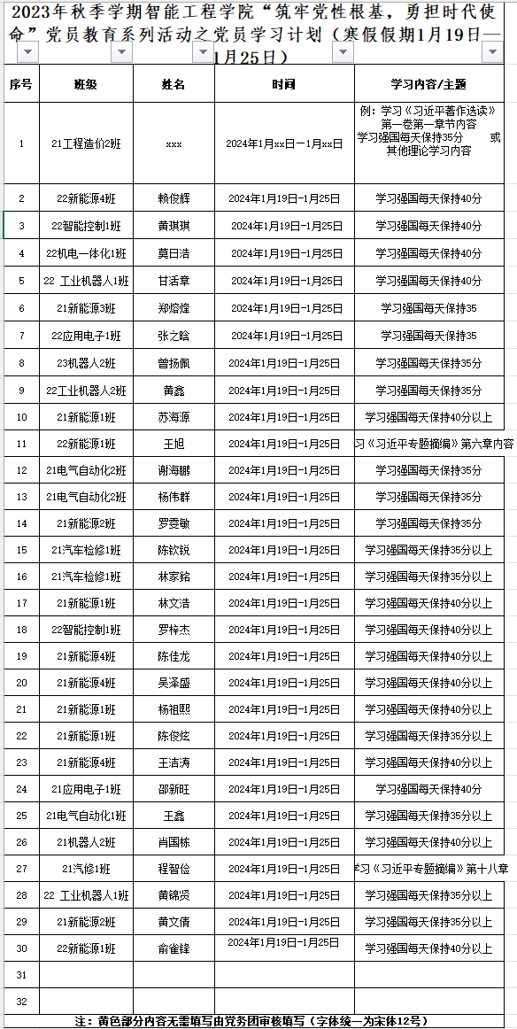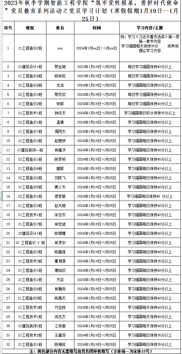 为深化党员的自我教育管理模式,切实提升党员自我教育管理实效,智能工程学院党总支针对现阶段党员教育管理不足现状,积极探索,组织开展党员自我教育学习活动,锚定学习目标,认真贯彻落实,狠抓推进整改,抓好奖励惩罚。现将寒假假期(1月19日——1月25日)党员学习计划及检查结果公布如下。