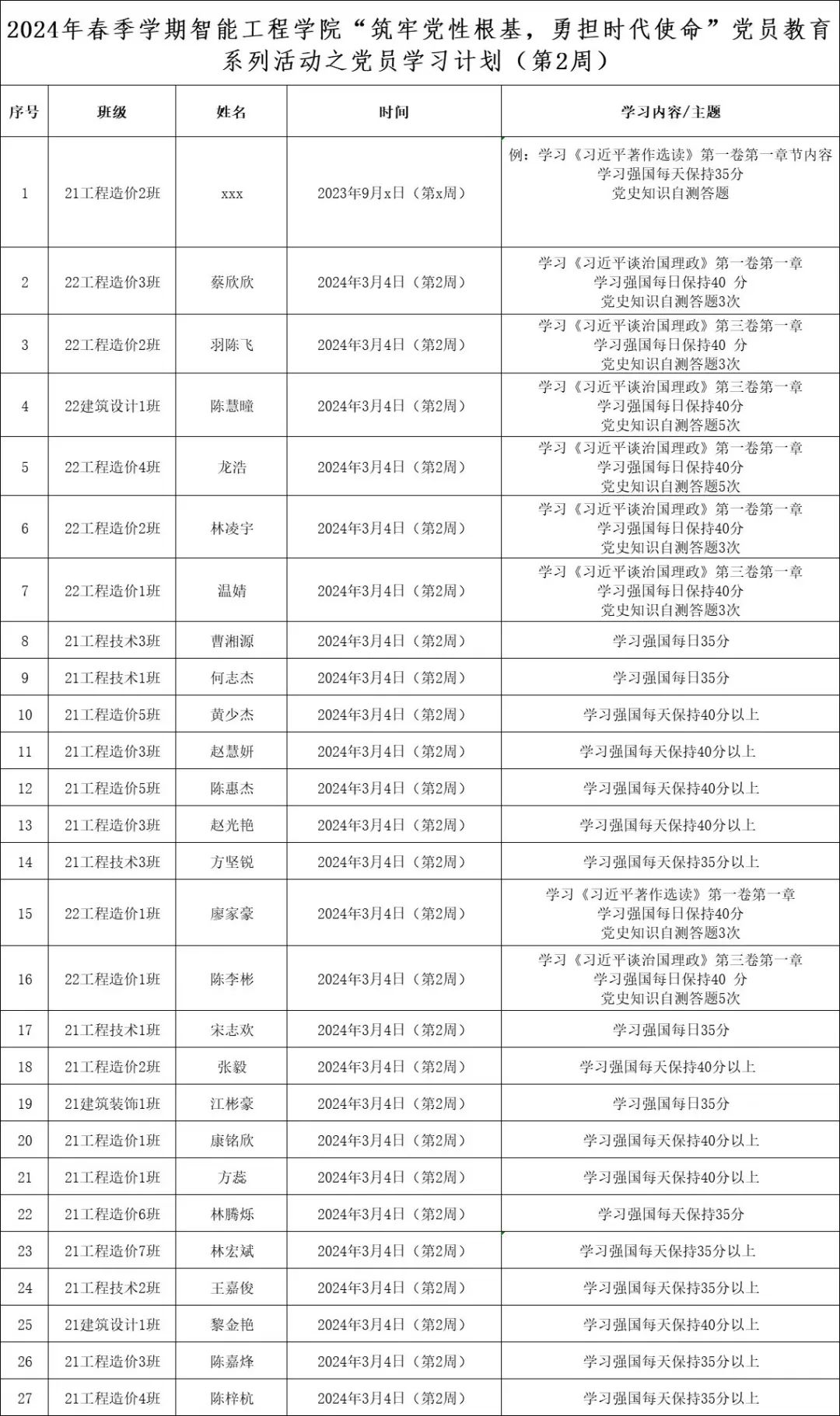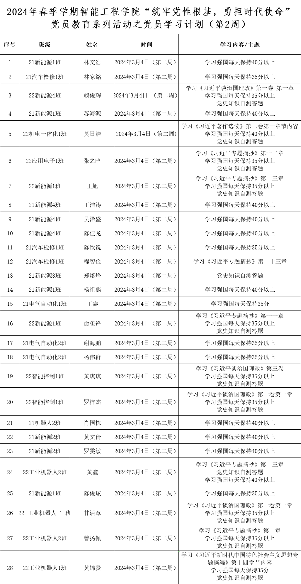 为深化党员的自我教育管理模式,切实提升党员自我教育管理实效,智能工程学院党总支针对现阶段党员教育管理不足现状,积极探索,组织开展党员自我教育学习活动,锚定学习目标,认真贯彻落实,狠抓推进整改,抓好奖励惩罚。现将第二周党员学习计划及检查结果公布如下。