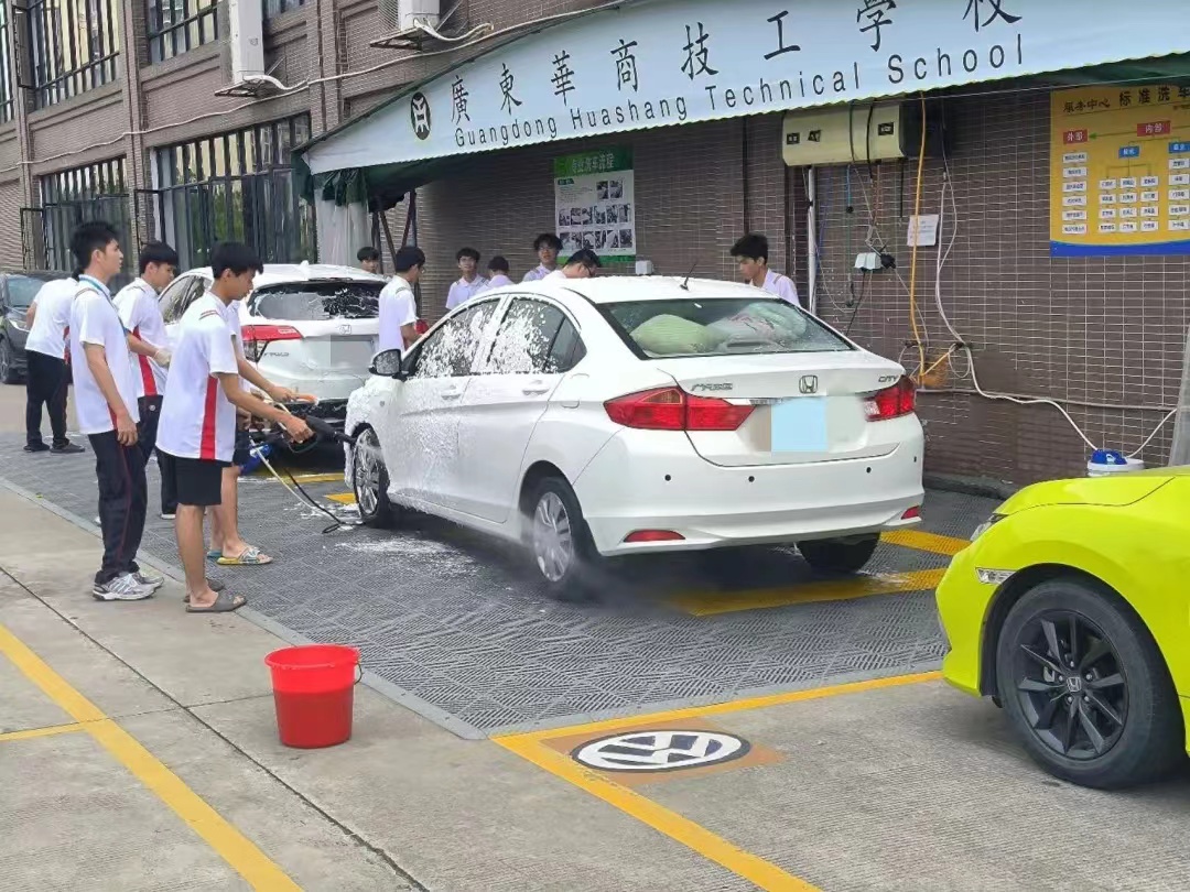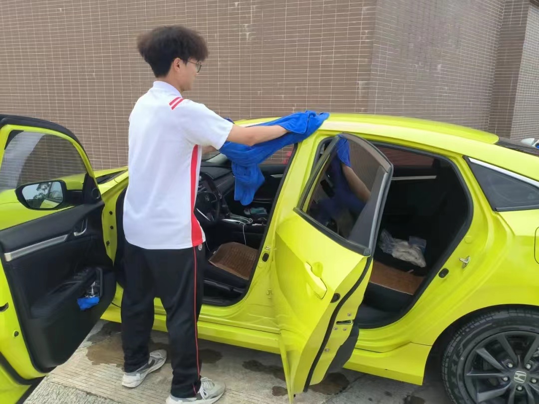活动中,学生党员们分工明确,工作细致,从汽车接待、喷水、喷洒泡沫、冲洗、擦干到交车,大家热情高涨,每个环节环环相扣,一番努力后,一辆辆布满灰尘的汽车与电瓶车犹如崭新出厂。