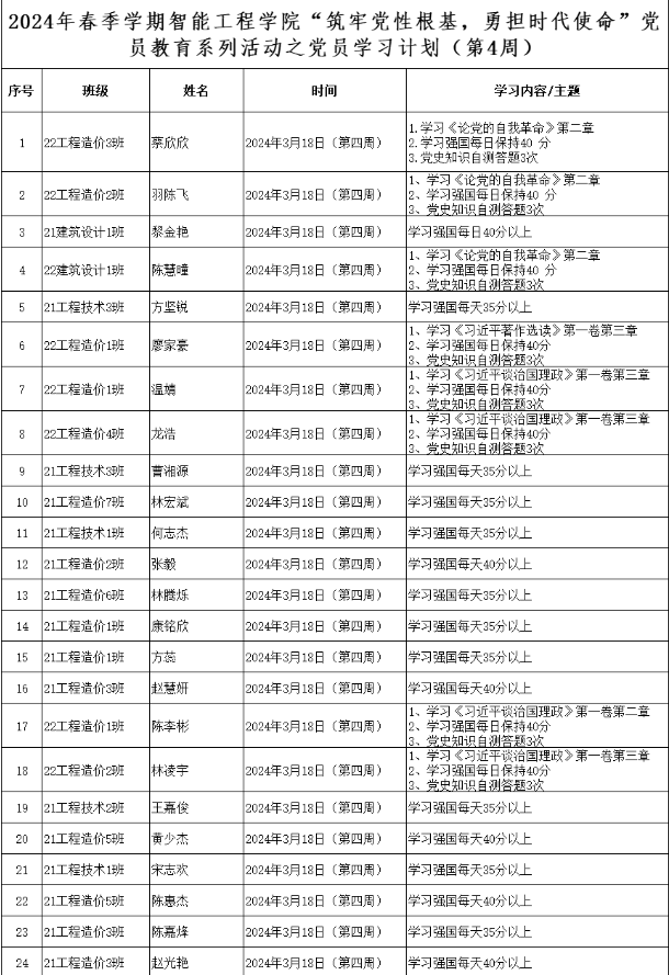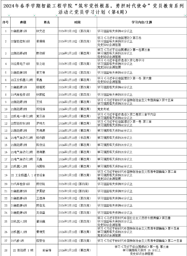 为深化党员的自我教育管理模式,切实提升党员自我教育管理实效,智能工程学院党总支针对现阶段党员教育管理不足现状,积极探索,组织开展党员自我教育学习活动,锚定学习目标,认真贯彻落实,狠抓推进整改,抓好奖励惩罚。现将第二周党员学习计划及检查结果公布如下。