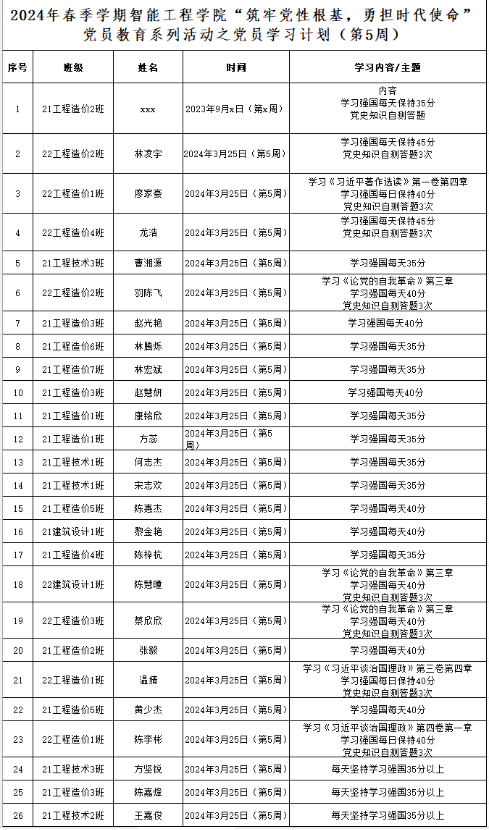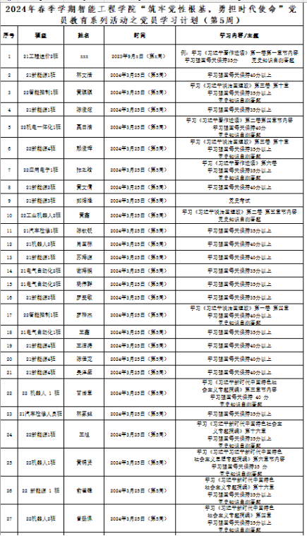 为深化党员的自我教育管理模式,切实提升党员自我教育管理实效,智能工程学院党总支针对现阶段党员教育管理不足现状,积极探索,组织开展党员自我教育学习活动,锚定学习目标,认真贯彻落实,狠抓推进整改,抓好奖励惩罚。现将第五周党员学习计划及检查结果公布如下。