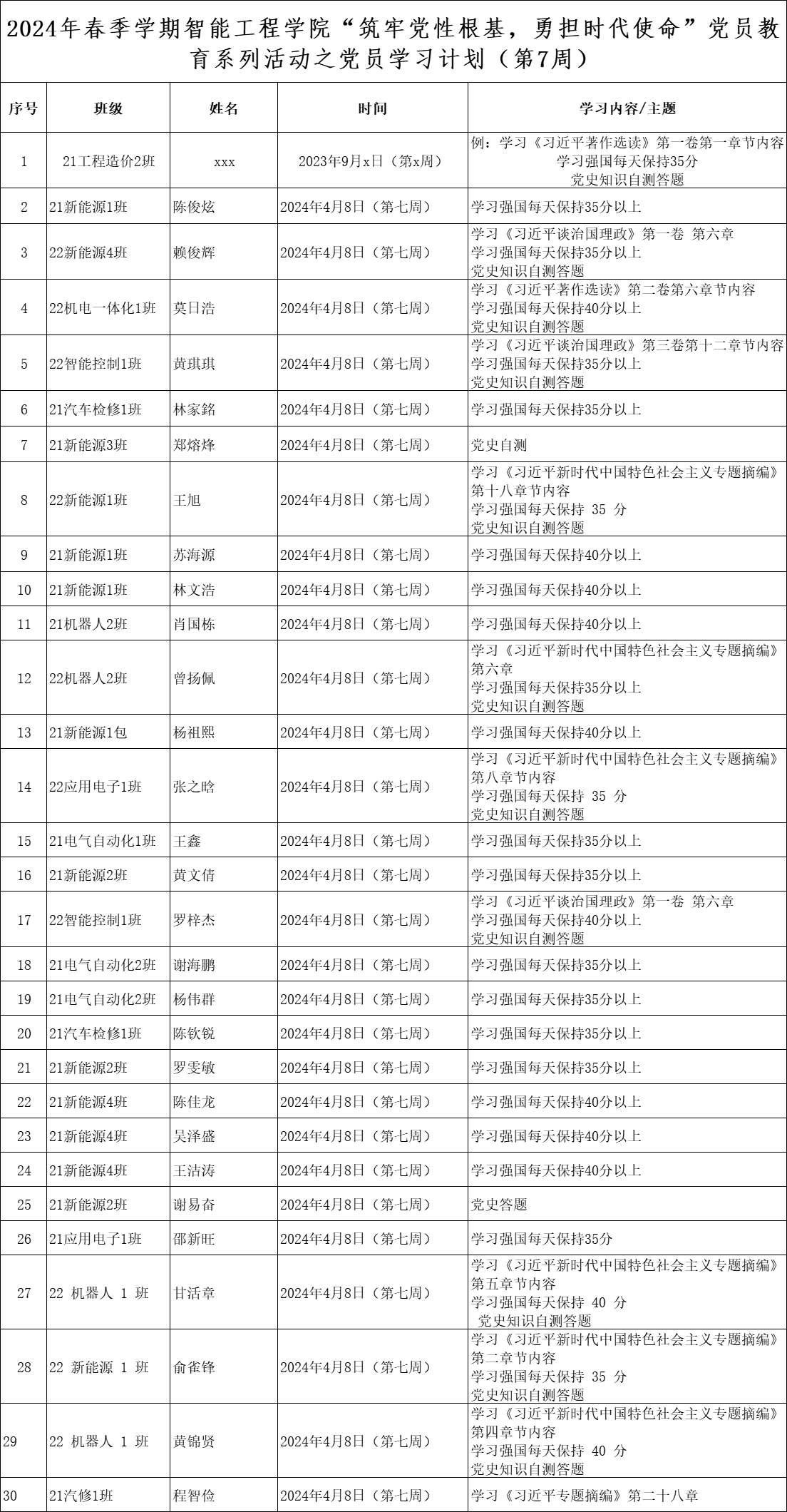 为深化党员的自我教育管理模式,切实提升党员自我教育管理实效,智能工程学院党总支针对现阶段党员教育管理不足现状,积极探索,组织开展党员自我教育学习活动,锚定学习目标,认真贯彻落实,狠抓推进整改,抓好奖励惩罚。现将第七周党员学习计划及检查结果公布如下。