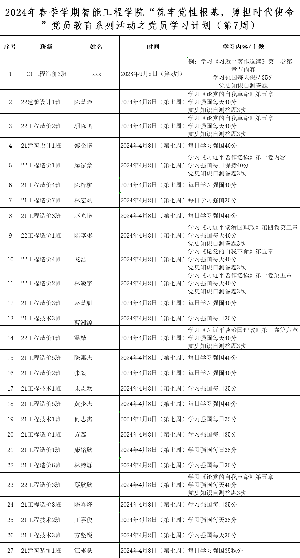 第二周学生党员学习计划表
