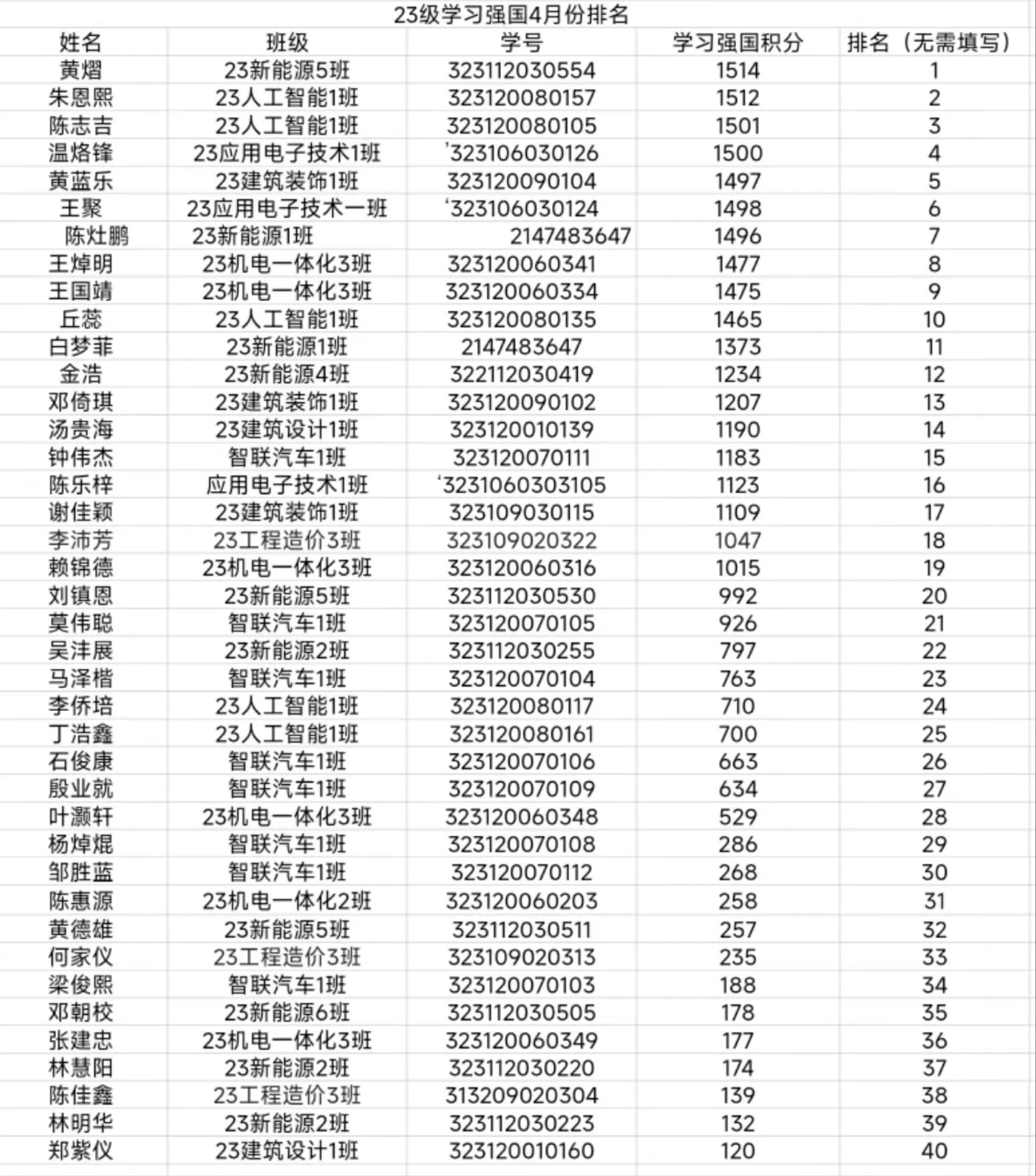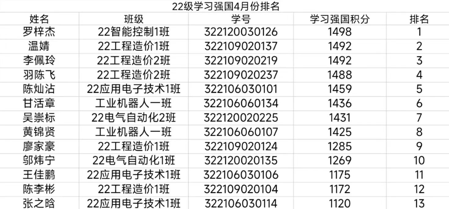 为进一步加大“学习强国”学习平台的宣传推广力度,充分发挥平台的引领作用,深入学习贯彻党的二十大精神,营造真学、深学、细学的学习氛围,智能工程学院以“学习强国”积分情况为依据,每月持续推出学习强国积分排行榜,对学习积分优秀的同学进行亮晒,推动“学习强国”在我院走深、走实、走心,掀起“学思践悟强担当,勇毅前行建新功”的热潮。